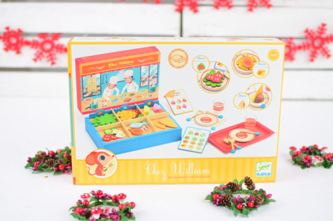 Kolejną „jedzeniową” propozycją jest Restauracja Djeco. Zestaw „full wypas” w skład którego wchodzą bar z przegródkami, 2 menu (lody oraz dania główne), naczynia (talerzyki, sztućce, kubeczki), tacka oraz filcowe i drewniane artykuły spożywcze. Całość oczywiście zapakowana w mega gruby kartonik, który stanowi podstawę baru. Zestaw polecany jest dla dzieci od 4 lat w górę. Wiemy z doświadczenia, że zabawy w naśladowanie uwielbiają dzieci w różnym wieku. Zarówno chłopcy jak i dziewczynki serwują dania swoim rodzicom lub wyprawiają przyjęcia pluszakom. Często tego typu zabawy to zalążek przyszłych pasji i zainteresowań. Kto wie może i Twój Maluch to przyszły „MasterChef”? 🙂