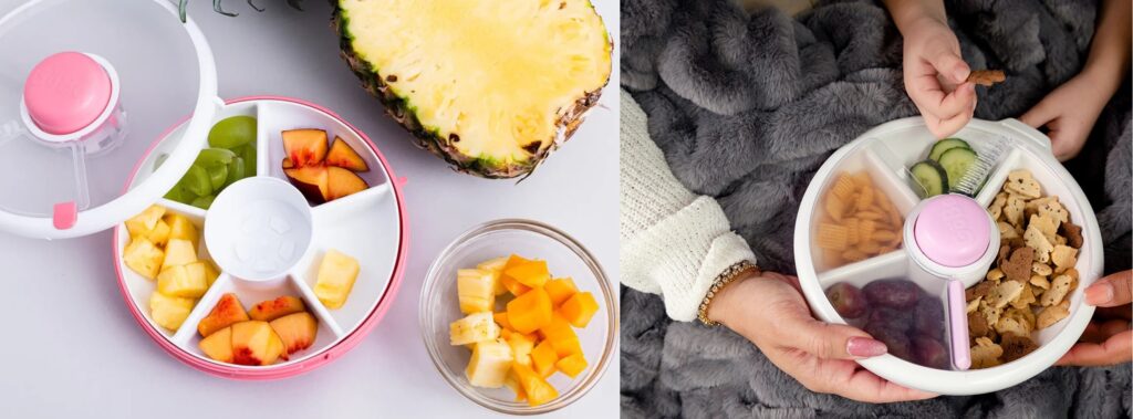- Snack Spinner Slide to pojemnik z czterema przegródkami. Dzięki przesuwanej klapce dziecko ma łatwy dostęp do wybranych przekąsek, które chce zjeść. Jedna z przegródek jest większa, co umożliwia umieszczenie w środku czegoś większego, np. zdrowego batona lub połowy banana. Sprawdzi się na szkolnych przerwach czy podczas wycieczek.