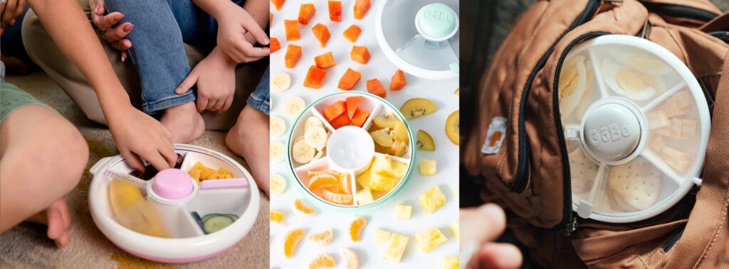 Każdy pojemnik GoBe Kids posiada innowacyjne przegródki, które umożliwiają dziecku łatwe wybieranie przekąsek dzięki prostemu naciśnięciu przycisku. W zależności od modelu, dostępne są różne liczby przegródek, co pozwala na rozdzielenie różnych smakołyków, takich jak owoce, warzywa lub orzechy. Po naciśnięciu przycisku przegródki obracają się. Każde naciśnięcie to obrót spinnera o jedną przegródkę do przodu. Nad jedną z nich znajduje się otwierana klapka umożliwiająca wyjęcie jedzenia ze środka. To rozwiązanie sprawia, że jedzenie staje się nie tylko łatwiejsze, ale i bardziej atrakcyjne dla maluchów. Dzięki temu dziecko ma kontrolę nad wyborem przekąski, co wpływa na większe zaangażowanie w zdrowe jedzenie. Dodatkowo Gobe posiada w ofercie model, w którym lunchbox i snack spinner występują, jako jedna śniadaniówka 2w1, co umożliwia przygotowywanie większych posiłków, takich jak np. kanapki.