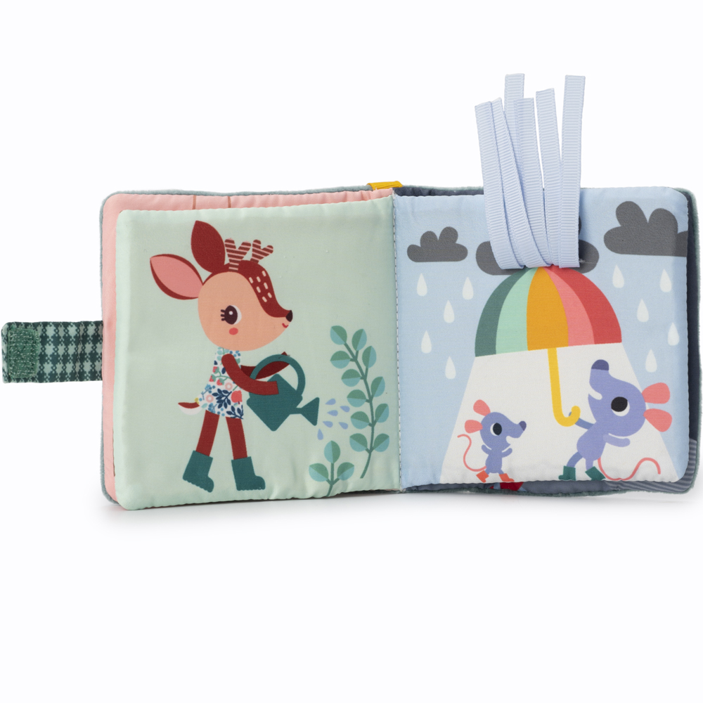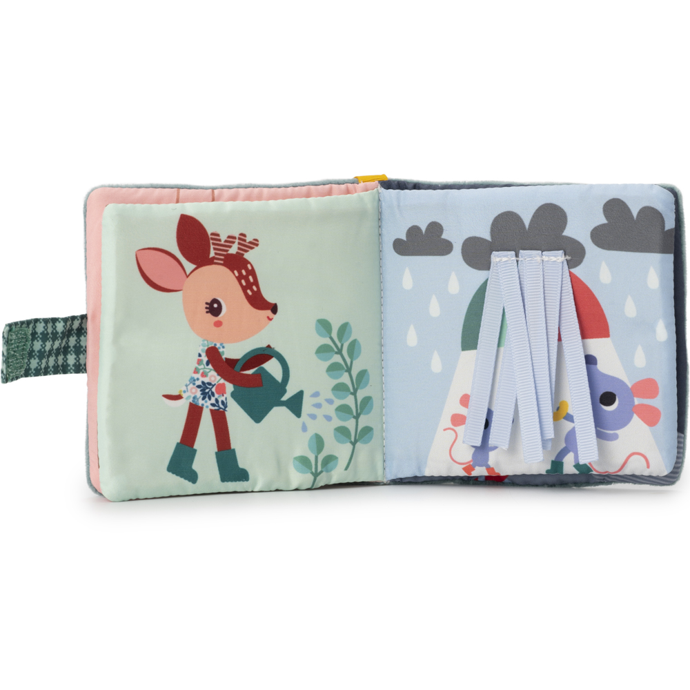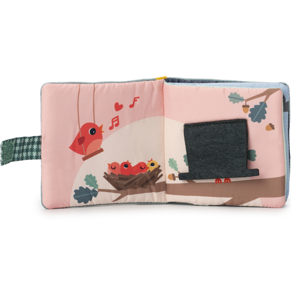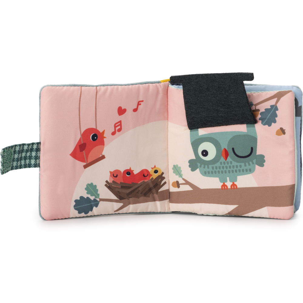 Pobudza dziecięcą wyobraźnię i ciekawość, aktywizuje zmysły wzroku, dotyku i słuchu. Do książeczki przyszyty jest okrągły fakturowany żółty gryzak z silikonu, który przynosi ulgę w trudnym okresie ząbkowania, a tasiemka w pepitkę zapinana jest na rzep i umożliwia zamocowanie książeczki, np. przy wózku. Zabawka jest świetnym sposobem na zaszczepienie w maluszku miłości do książek.