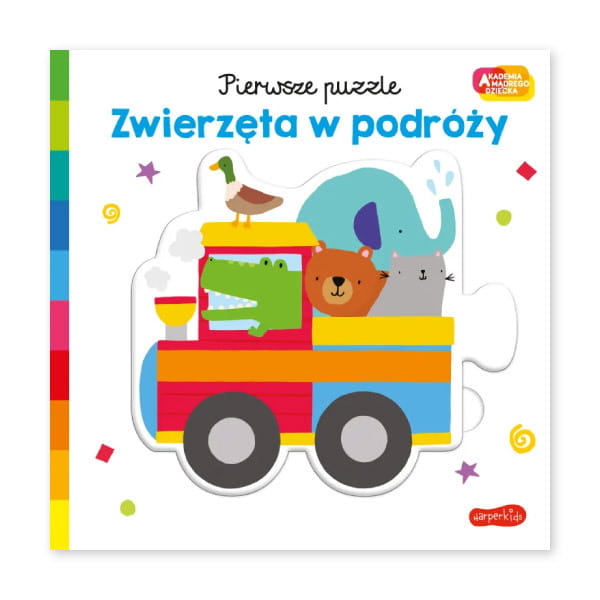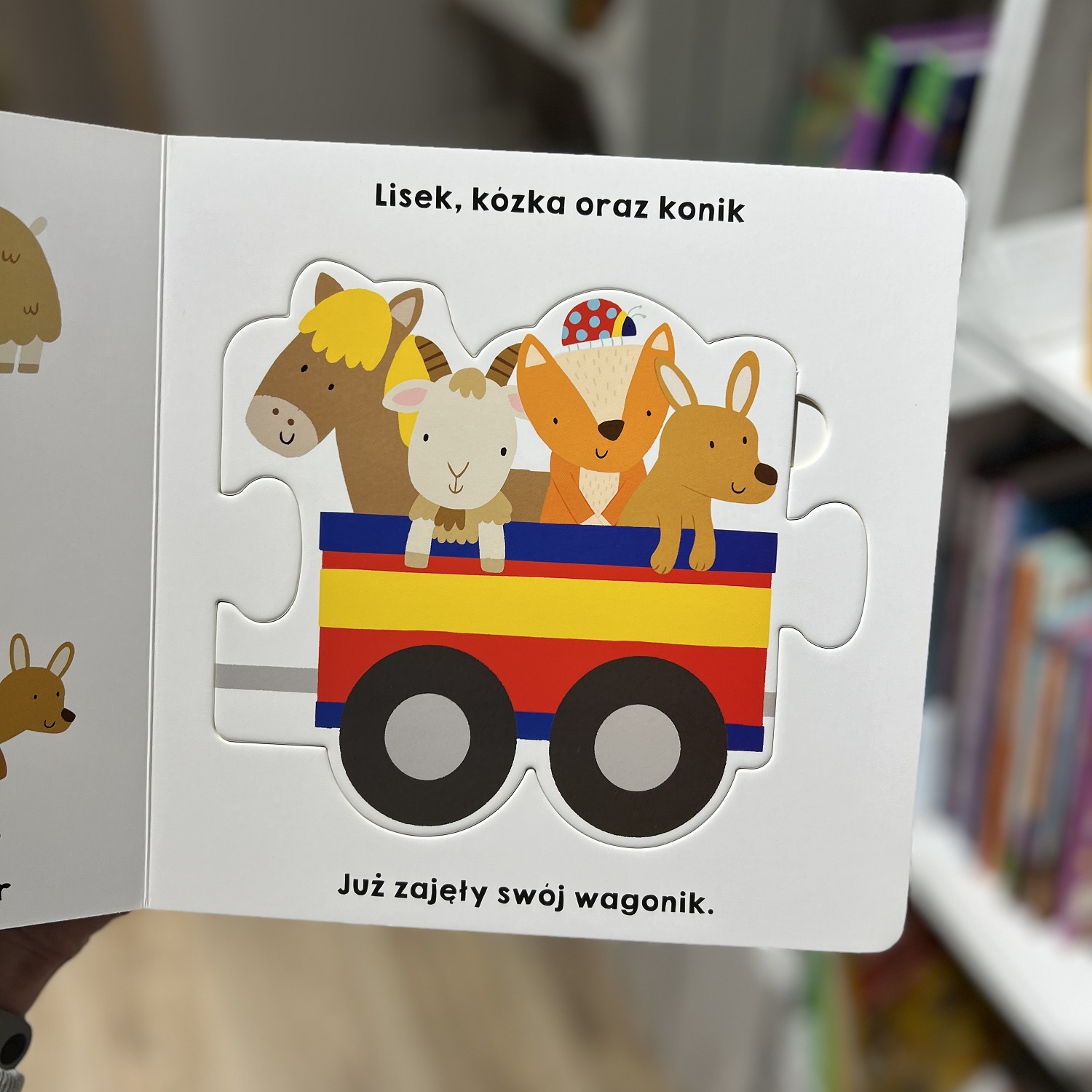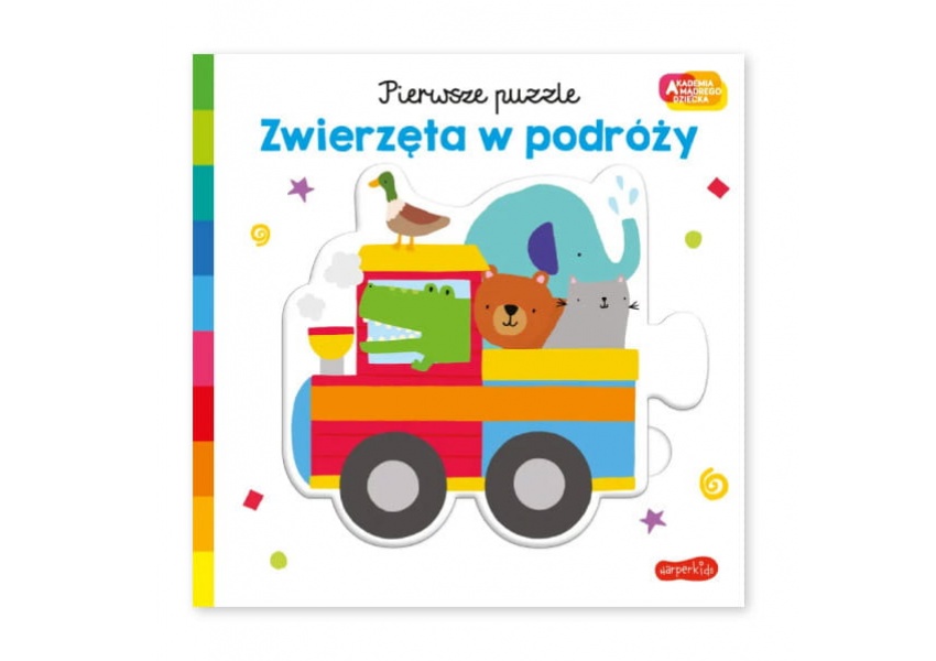 Nowa seria Pierwsze puzzle to kolorowe książeczki uczące nowych słów. Duże kartonowe strony oraz duże puzzle ułatwiają dziecku przerzucanie stron. Książeczki wspierają rozwój małej motoryki oraz ćwiczą koncentracje u dziecka. W książeczce Zwierzęta w podróży przedstawione zostały zwierzęta. Dodatkowo na każdej stronie znajduje się 1 duży puzzel wagonik. Po wyjęciu puzzli, można je połączyć tworząc pociąg do zabawy.