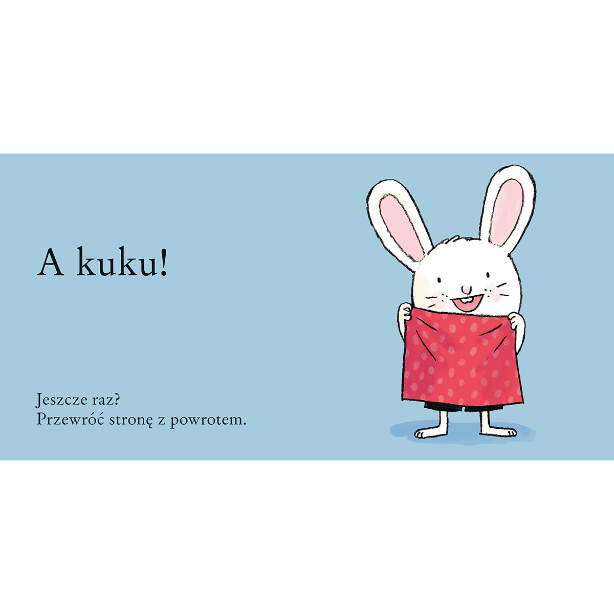A kuku! Króliczek zaprasza do zabawy wszystkie maluchy! Pobawcie się z nim w "Nie ma, nie ma, jest", pobujajcie go na huśtawce, pochlapcie się z nim wodą i sprawdźcie, jakie sztuczki zna jego przytulanka. Wykonujcie proste instrukcje, by króliczek bawił się razem z wami. Przewracajcie strony w tę i z powrotem, by wprawić go w ruch. I uważajcie, bo może zrobić wam jakiegoś psikusa!