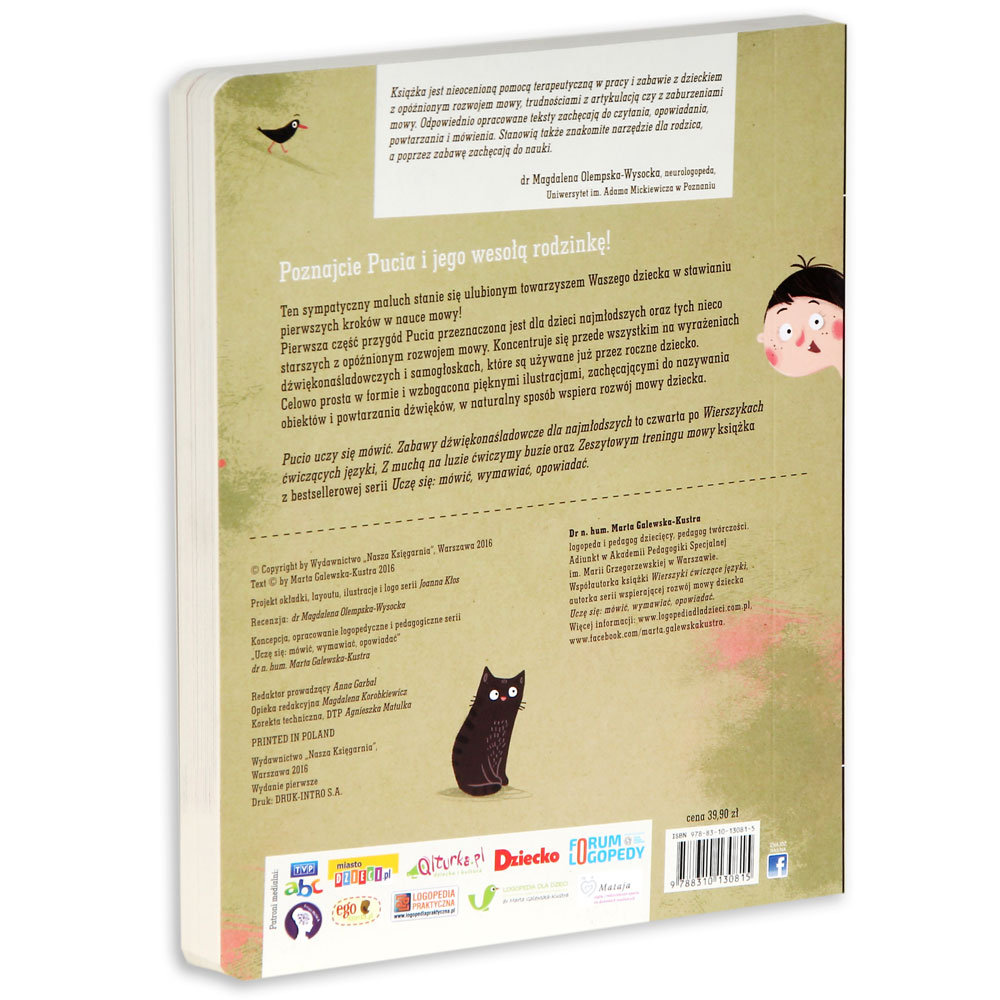 Poznajcie Pucia i jego wesołą rodzinkę! Ten sympatyczny maluch stanie się ulubionym towarzyszem Waszego dziecka w stawianiu pierwszych kroków w nauce mowy! Pierwsza część przygód Pucia przeznaczona jest dla dzieci najmłodszych oraz tych nieco starszych z opóźnionym rozwojem mowy. Koncentruje się przede wszystkim na wyrażeniach dźwiękonaśladowczych i samogłoskach, które są używane już przez roczne dziecko. Celowo prosta w formie i wzbogacona pięknymi ilustracjami, w naturalny sposób wspiera rozwój mowy dziecka.