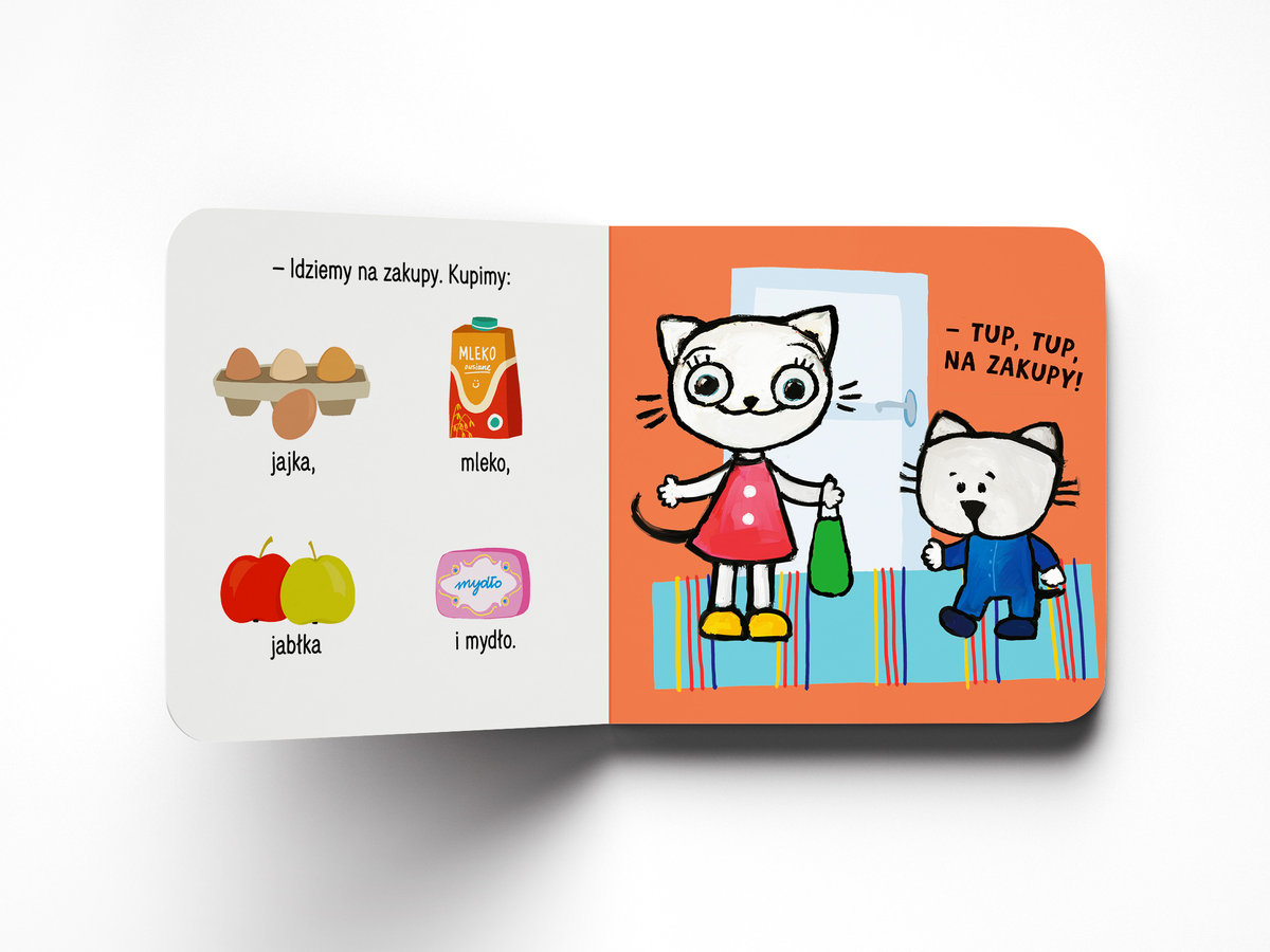Trzeba zapamiętać, co się chce kupić potrzebne są jajka, mleko, jabłka i mydło. Nunuś o wszystkim pamięta i dzielnie pomaga Kici Koci.