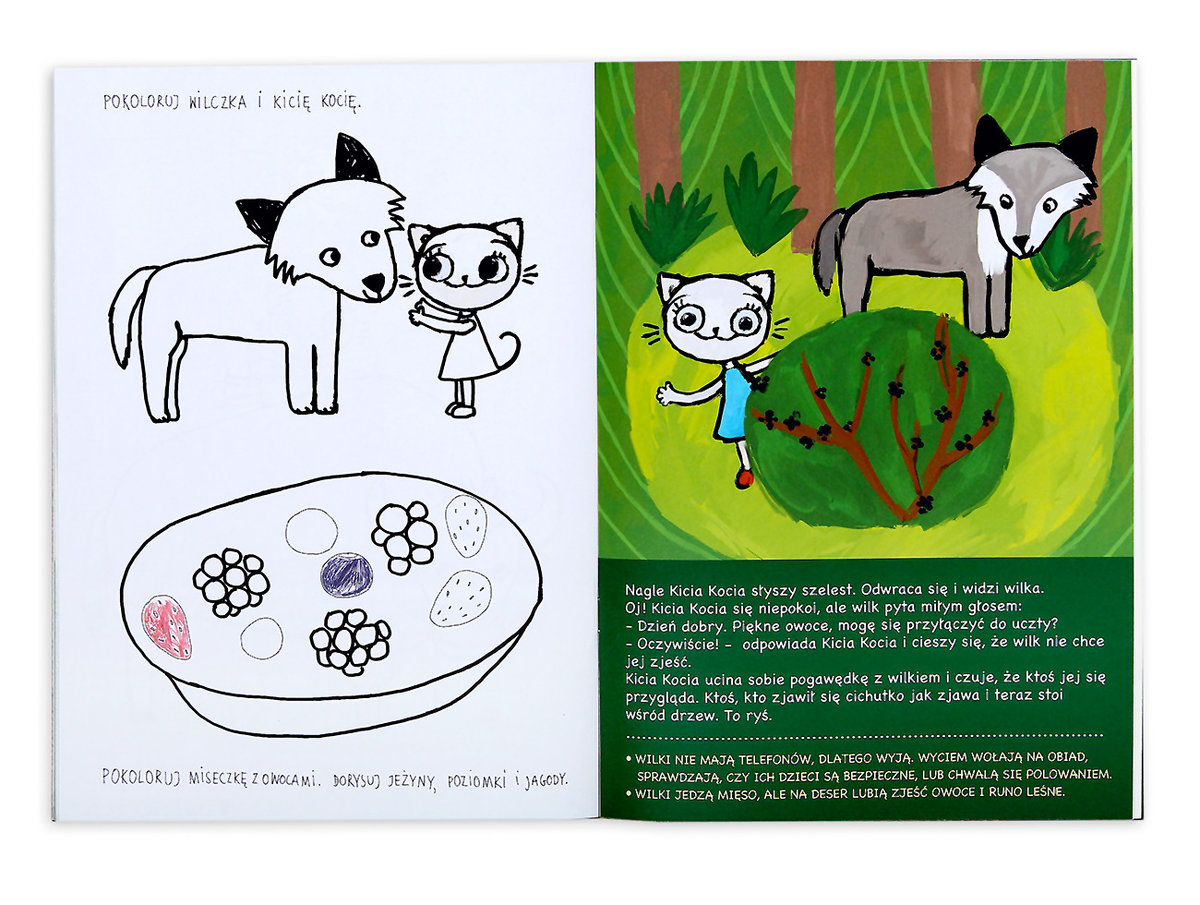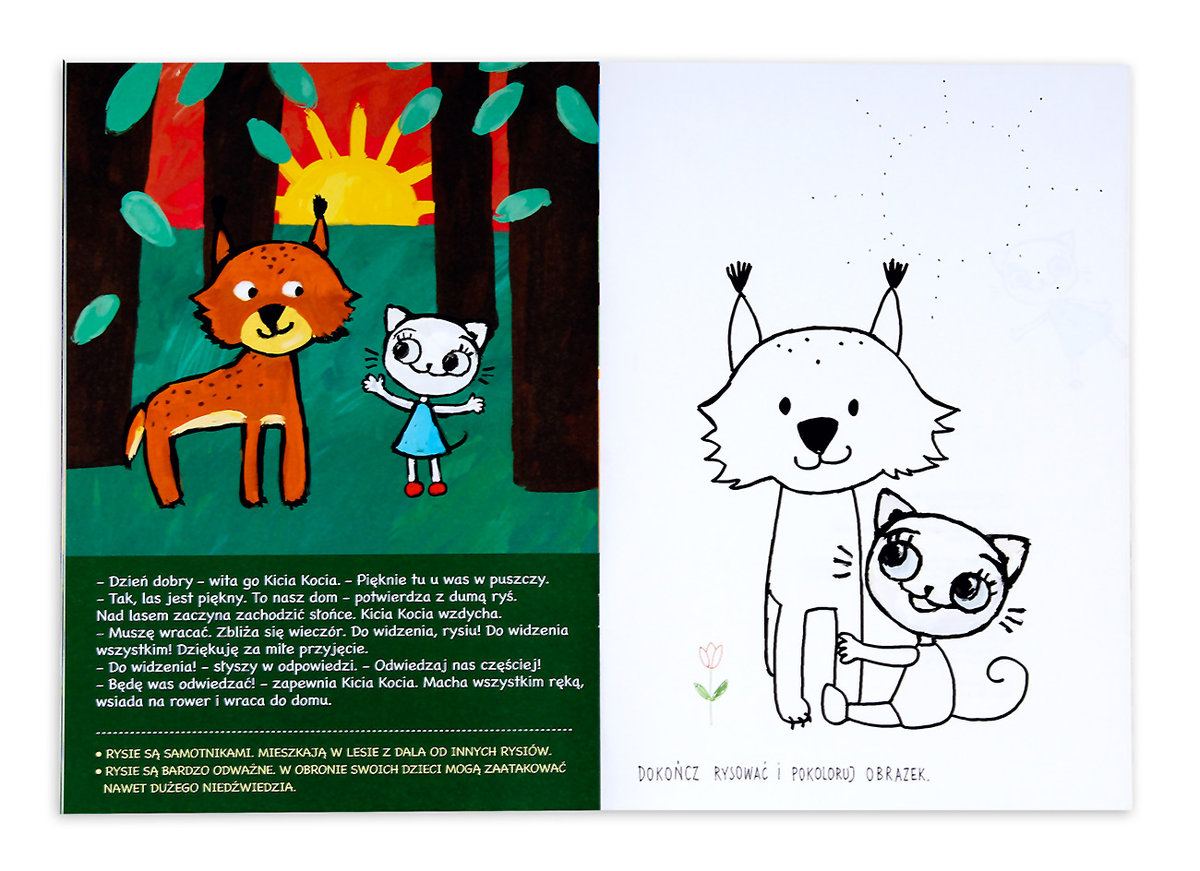 To książka, ale nie tylko. To także kolorowanka, szkicownik i notatnik, kolejne znakomite narzędzie do zabawy dla małych fanów Kici Koci. Tym razem wraz z rezolutną kotką mały czytelnik poznaje zwierzęta polskich puszcz i lasów. Dziecko może książkę czytać i oglądać, ale i współtworzyć. Może dopisać zdanie od siebie lub dorysować na ilustracji, co tylko zapragnie. Książki o Kici Koci są polecane przez Fundację ABCXXI Cała Polska Czyta Dzieciom.