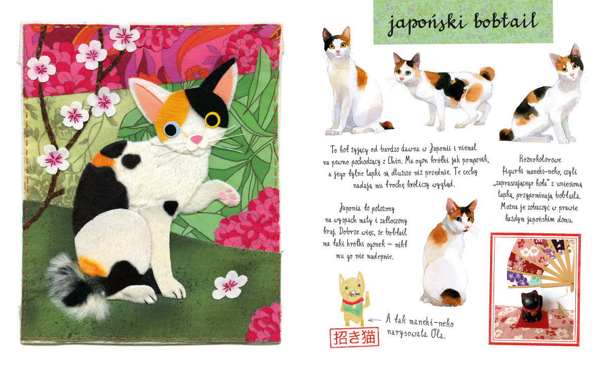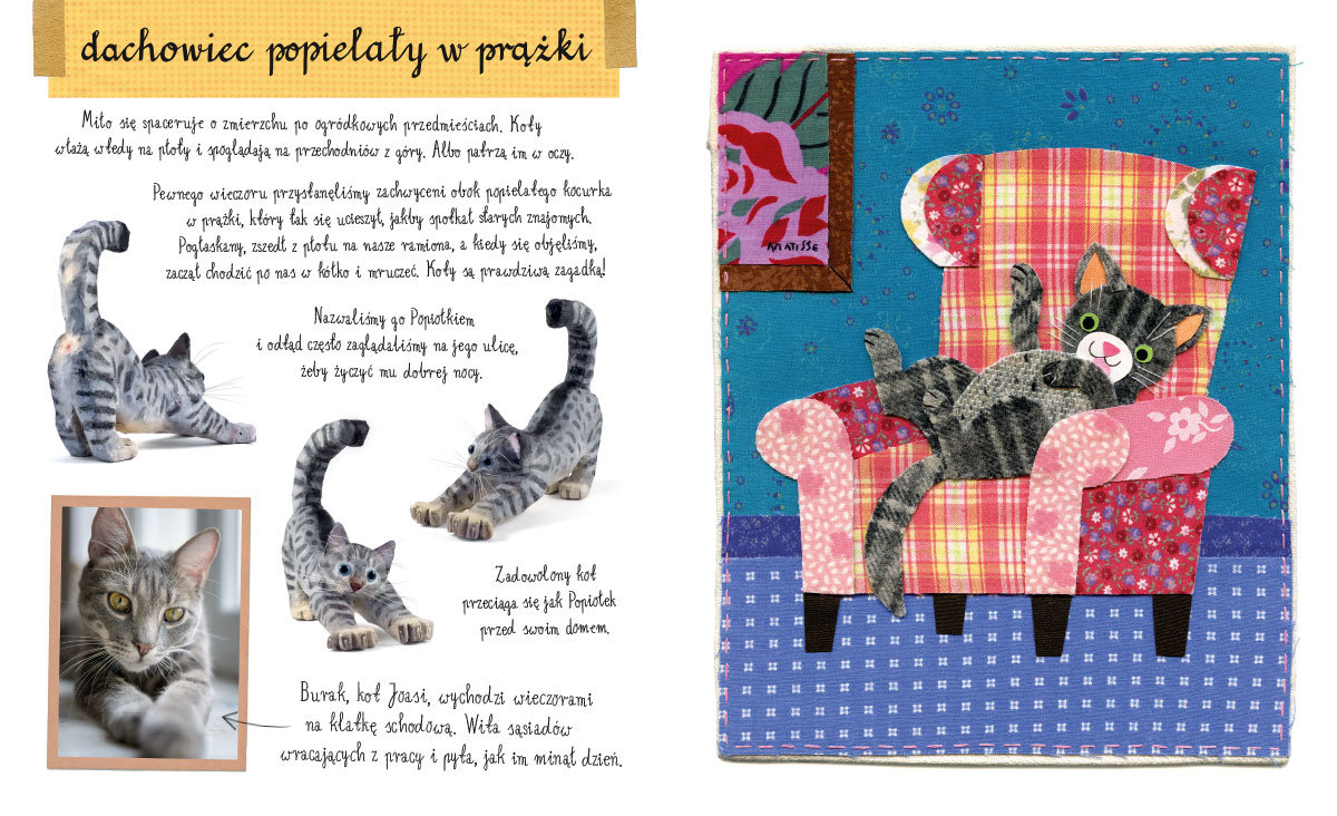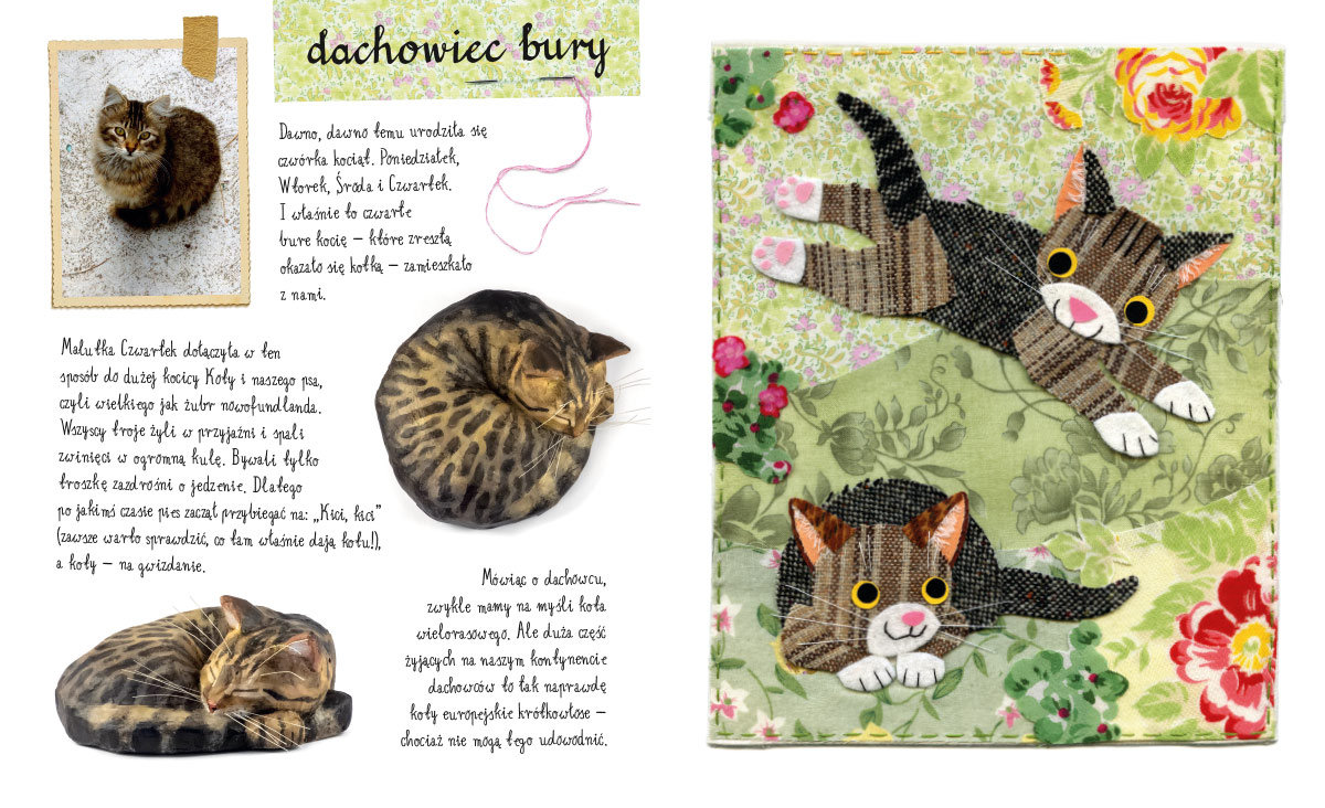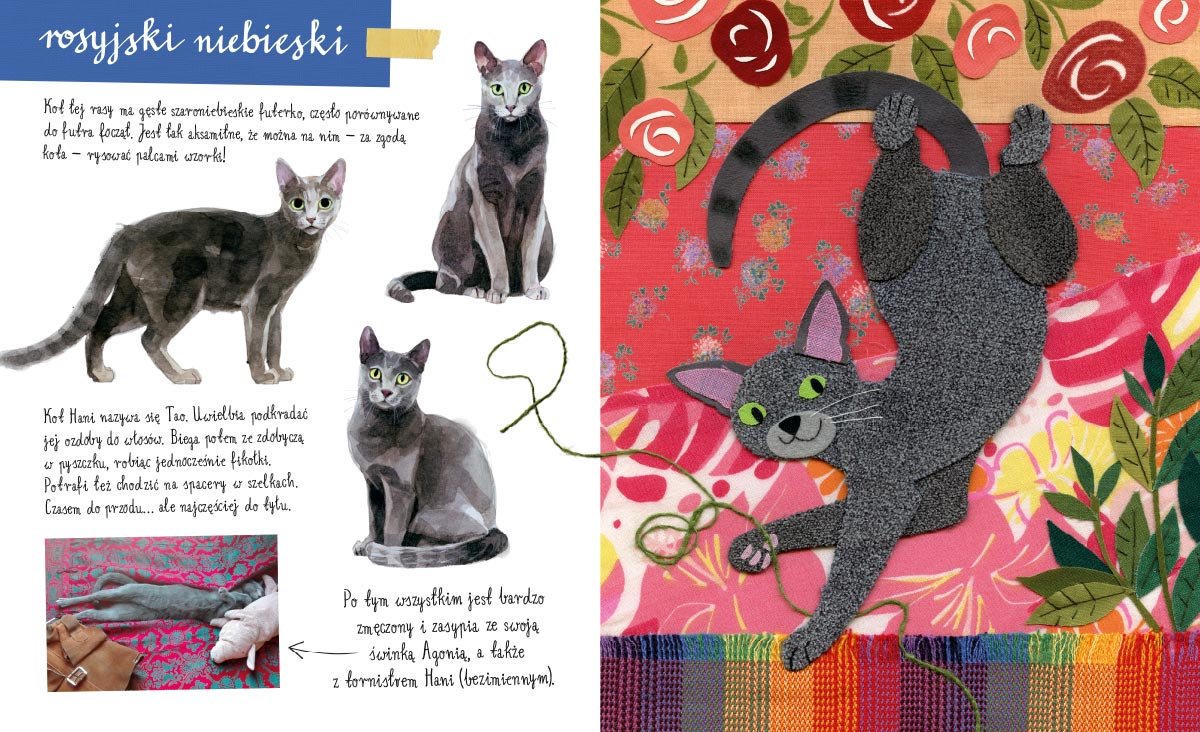 W czwartym już małym atlasie para znakomitych twórców składa hołd swojej wielkiej miłości: kotom. Napotkamy tu między innymi puchate koty norweskie, niebieskookie syjamy, japońskie koty z pomponikiem zamiast ogona, jak również kota nad kotami: wielorasowego dachowca. Osobiste historie przeplatają się w tej książce z dostosowanymi do wieku czytelnika informacjami o kociej naturze, o kocim języku czy o dzikich kuzynach kota domowego. Tekstom towarzyszą zachwycające ilustracje: pełne czułości kocie portrety wyczarowane z tkanin, eleganckie akwarele oraz przestrzenne koty z papier mch. Nie mogło też zabraknąć fotografii i oczywiście dziecięcych rysunków, które wykonała zaprzyjaźniona z autorami Ola.