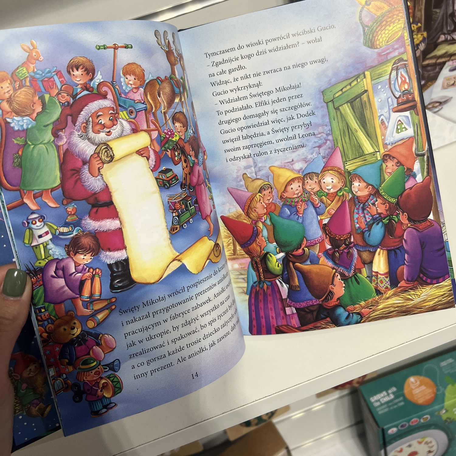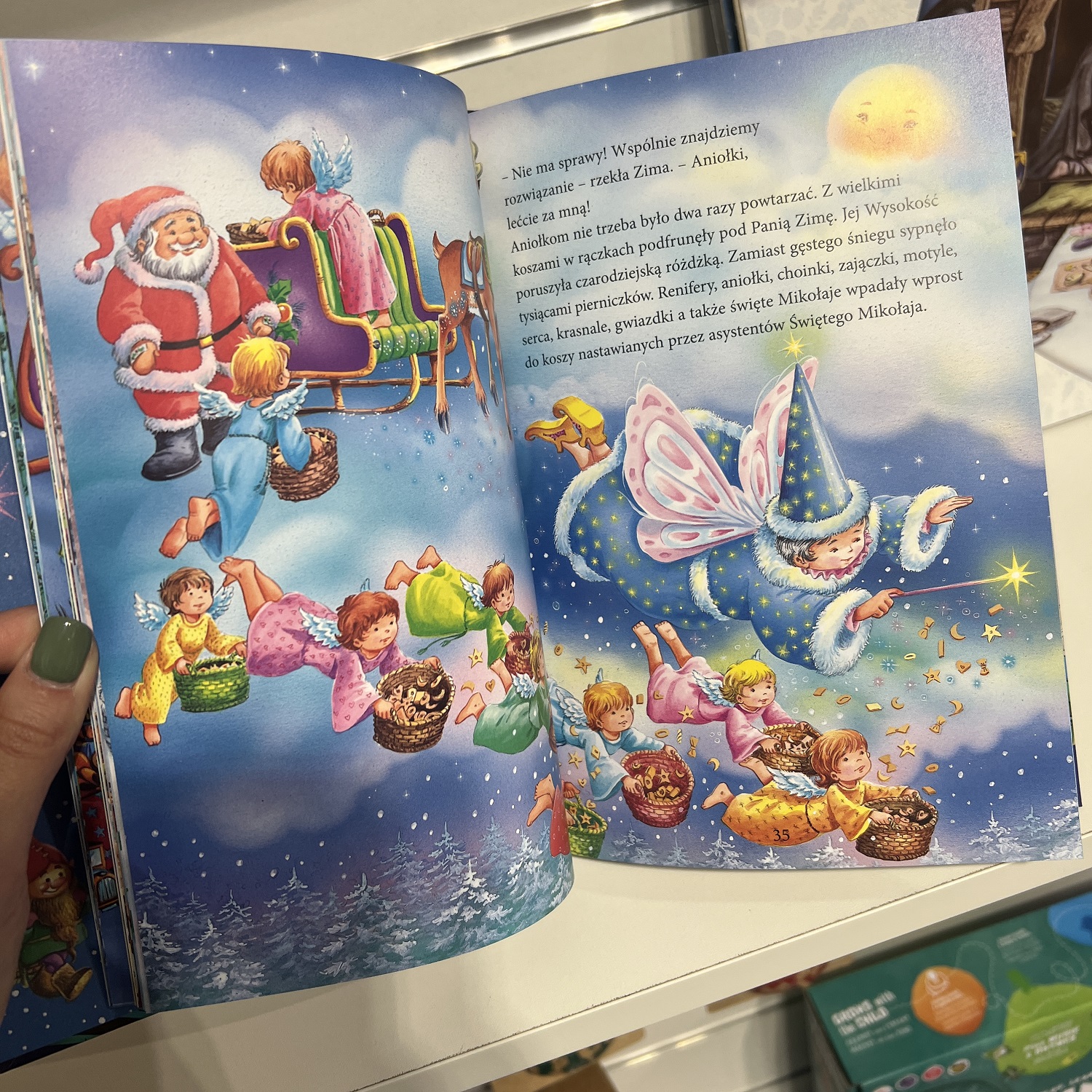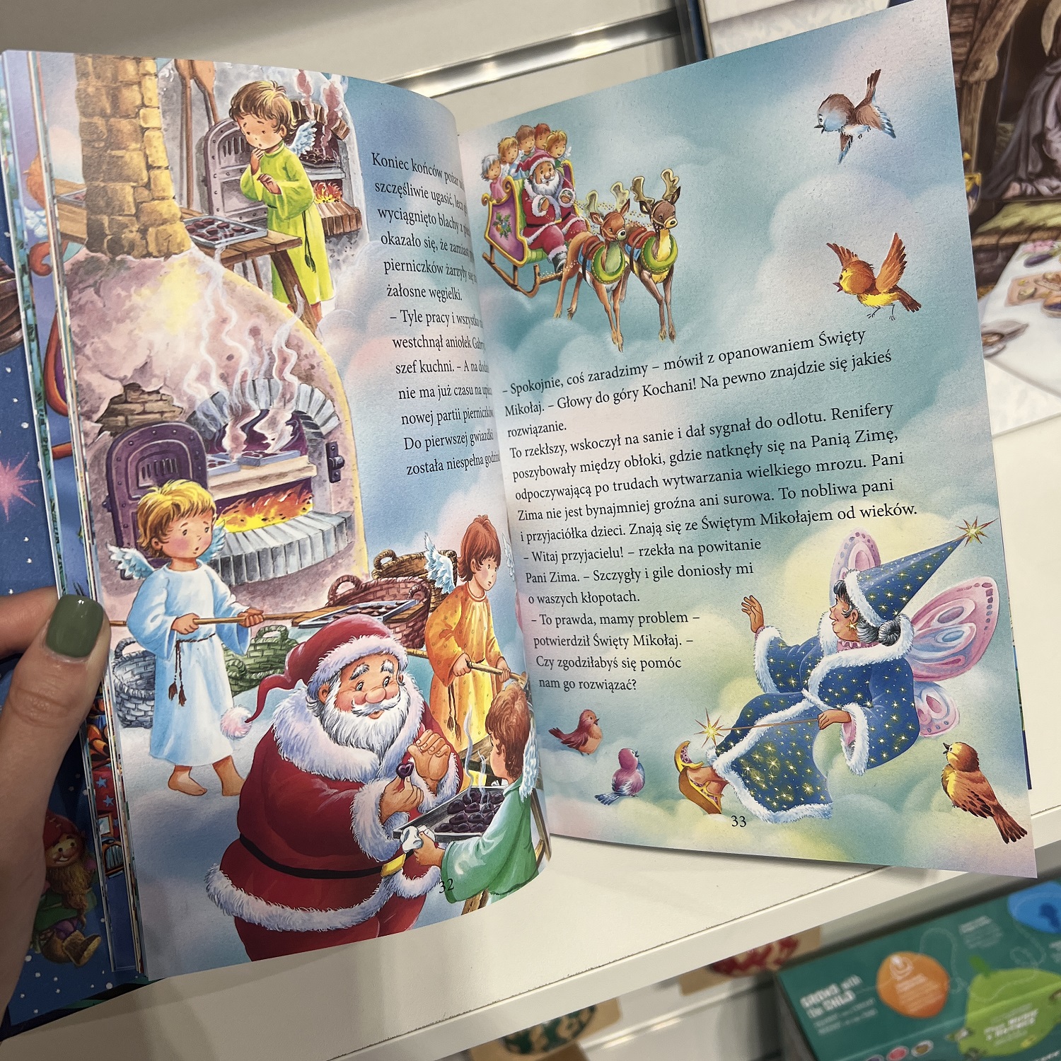 Dzieci kochają, kiedy opowiada im się o Świętym Mikołaju! Ta urocza, pięknie ilustrowana książka przenosi małych czytelników w magiczny i radosny świat całkiem podobny do naszego, tyle że oprócz ludzi żyją w nim Święty Mikołaj, elfy leśne zwane Troszkami i Pani Zima. W opowiadaniach przeczytamy między innymi o liście do Świętego Mikołaja, o podbiegunowej fabryce zabawek, o czarodziejskich piernikach, o aniołkach, o cudownej choince, a także o dobrodusznym zakonniku Gerwazym. W książce znajdują się dodatkowo wskazówki, jak wykonać piękne ozdoby bożonarodzeniowe, oraz przepisy na wykwintne świąteczne ciasteczka i pierniki.