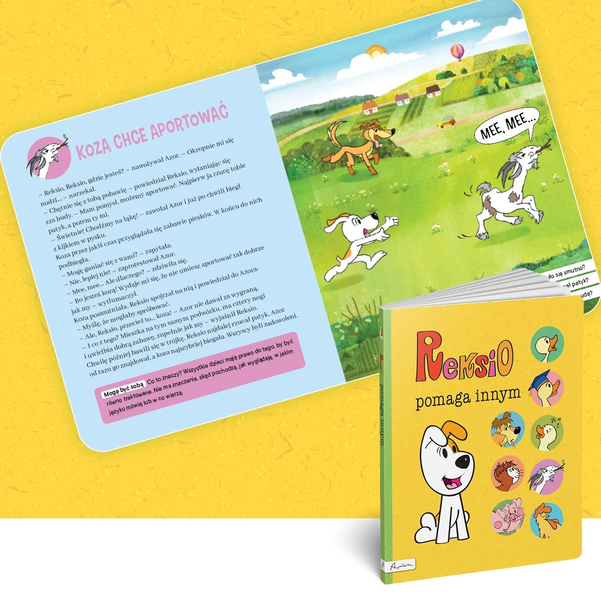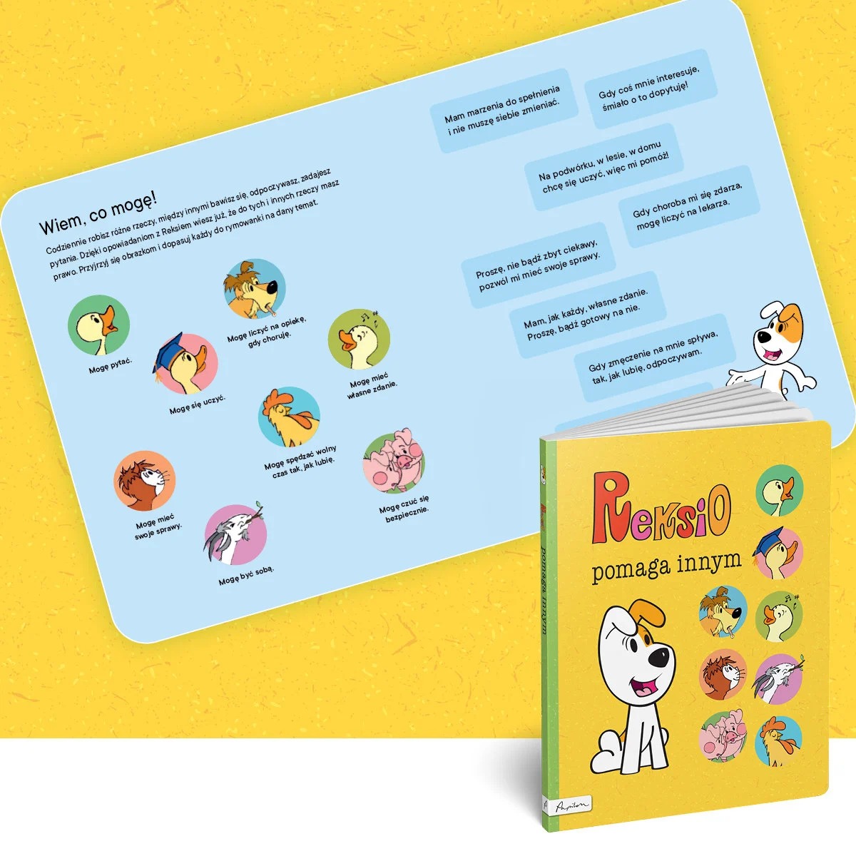Kultowy bohater powraca, by w prosty i przystępny sposób wspierać dzieci w odkrywaniu emocji i relacji. „Reksio pomaga innym” to zbiór krótkich, pełnych humoru historyjek, które przenoszą najmłodszych na dobrze znane podwórko. Każda opowieść staje się okazją do rozmowy o tym, co czujemy, jak wyrażać swoje myśli i jak budować więzi z innymi. To książka, która nie tylko bawi, ale też uczy – idealna do wspólnego czytania przed snem lub w ciągu dnia.