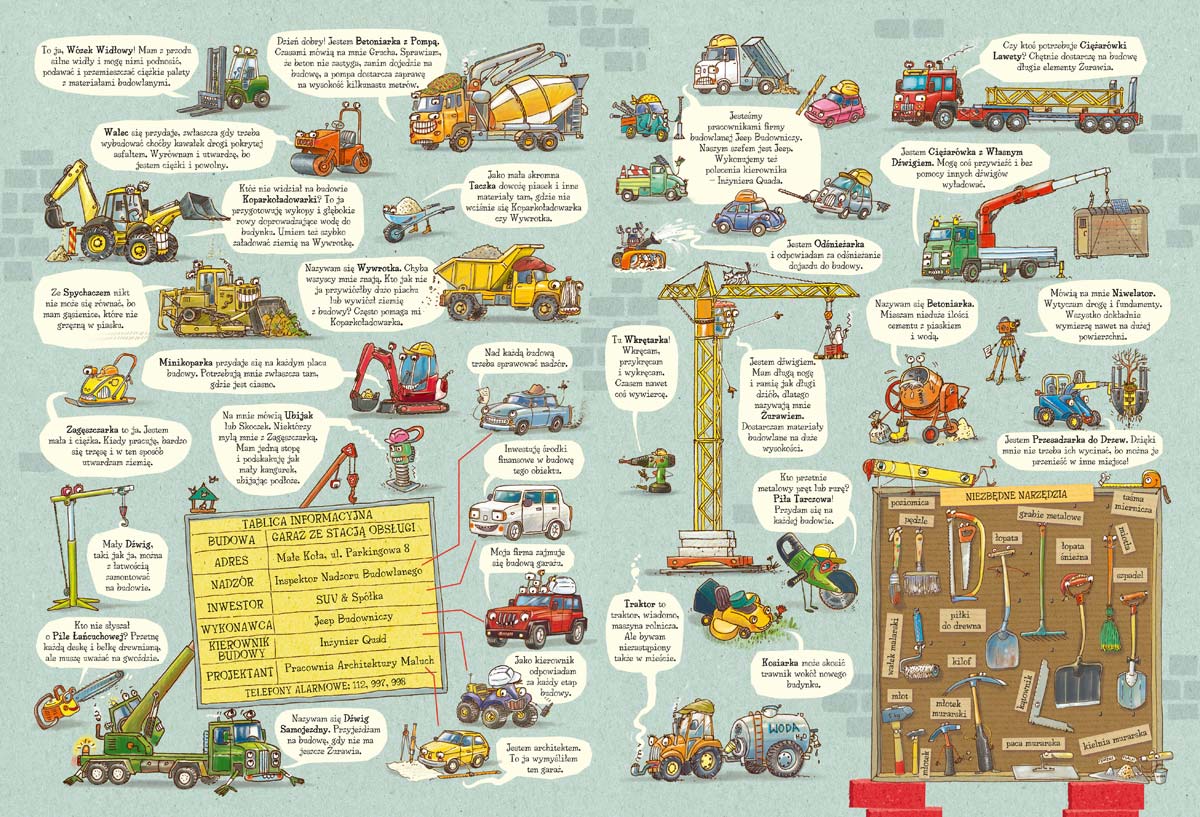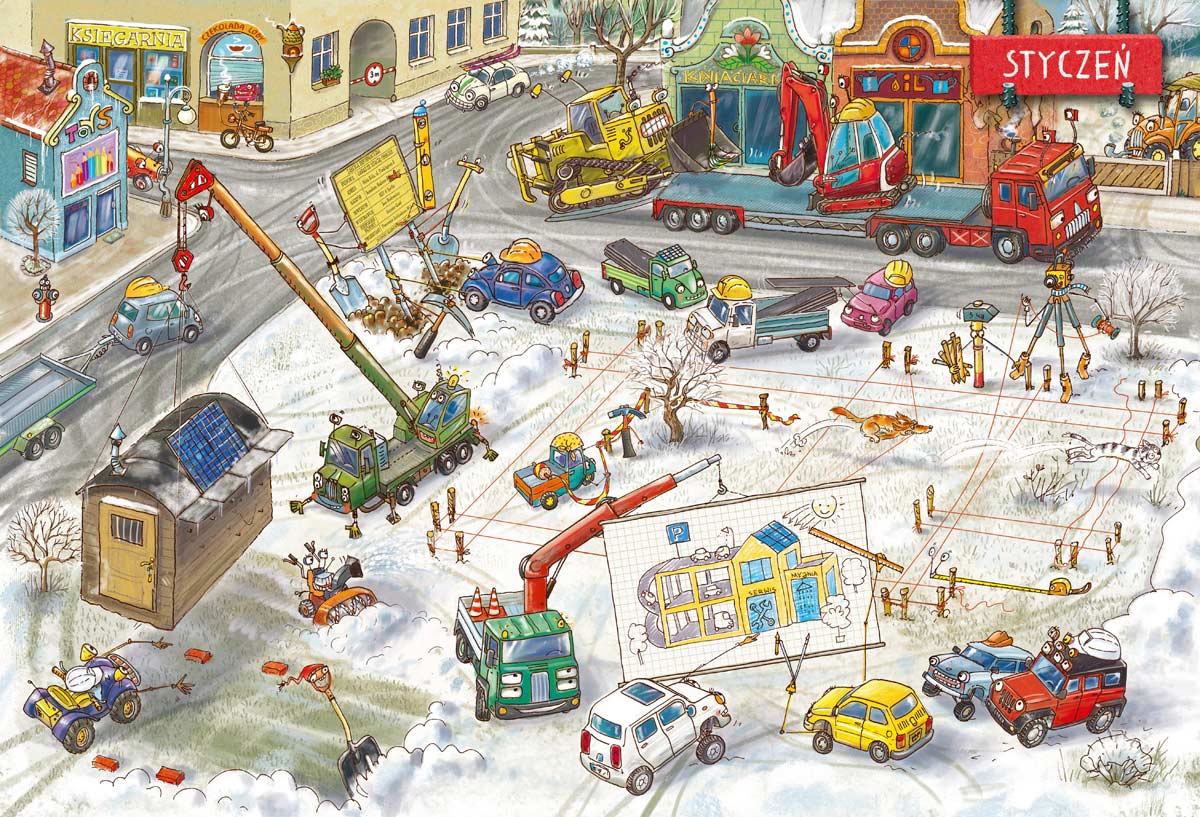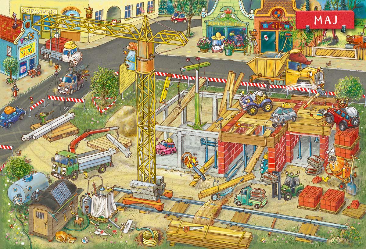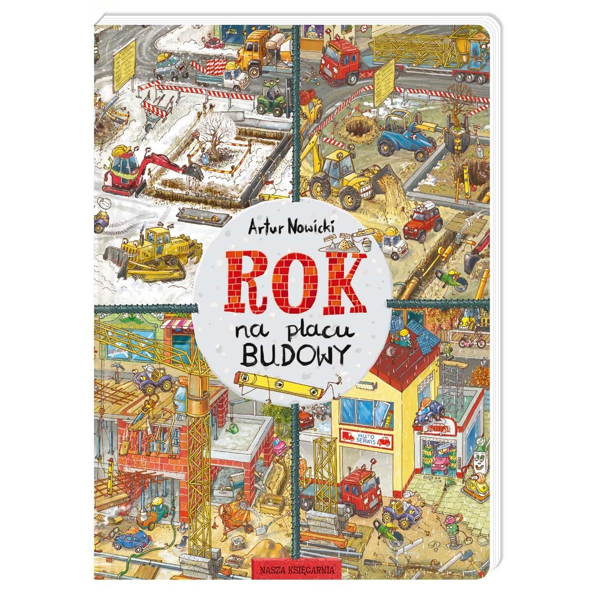 Nowa budowa zaczyna się w mieście. Niedługo powstanie garaż z myjnią oraz stacją obsługi pojazdów. Plac budowy opanowuje Jeep Budowniczy i jego zespół: Walec, Żuraw, Koparka, Betoniarka, Spychacz oraz wiele innych maszyn i pojazdów. Tyle tu do zrobienia! Potrzebujemy uporządkowanego terenu. Tam jakieś drzewo do przesadzenia. Fundamenty, stawianie ścian, tynkowanie. Na koniec Inspektor odbierze budynki. Do roboty zatem! Maszyny dzielnie pracują, w każdych warunkach pogodowych, pod czujnym okiem inwestora. Czy zdążą z uroczystym otwarciem w te święta? "Rok na placu budowy" składa się z 12 planszy, które obrazują zmiany jakie zachodzą w ciągu całego roku na placu budowy. Dwie dodatkowe ilustracje przedstawiają bohaterów oraz interaktywną zabawę, która stanowi świetną wielogodzinną rozrywkę. Doskonały sposób na pobudzenie wyobraźni, ćwiczenie zdolności opowiadania, spostrzegawczości i logicznego myślenia, a także dostrzegania zależności przyczyna-skutek.