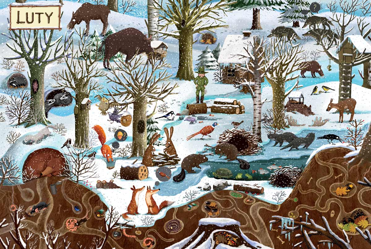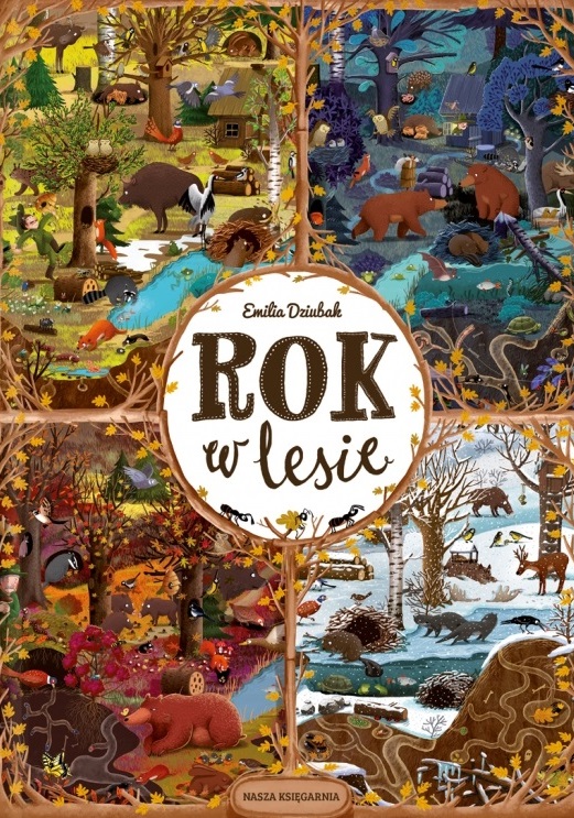 Dziki, wilki, bażanty, niedźwiadek, mrówki, dzięcioł, lisy, borsuk, zaskrońce, żaby, łoś i wiele innych zwierzaków zamieszkuje pewien las. Jak się bawią, a jak odpoczywają? Kto śpi w dzień, a kto w nocy? Kto się z kim lubi? Kto jakie ma przysmaki? Poszukajcie odpowiedzi na kartach tej niezwykłej książki. "Rok w lesie" zawiera dwanaście rozkładówek z kolejnymi miesiącami jednego roku. Każdy miesiąc to ten sam szczegółowo rozrysowany kadr lasu z mieszkańcami pokazanymi w innych sytuacjach, warunkach pogodowych, w innej porze dnia lub nocy. Dwie dodatkowe rozkładówki zawierają prezentację bohaterów i interaktywną zabawę.
