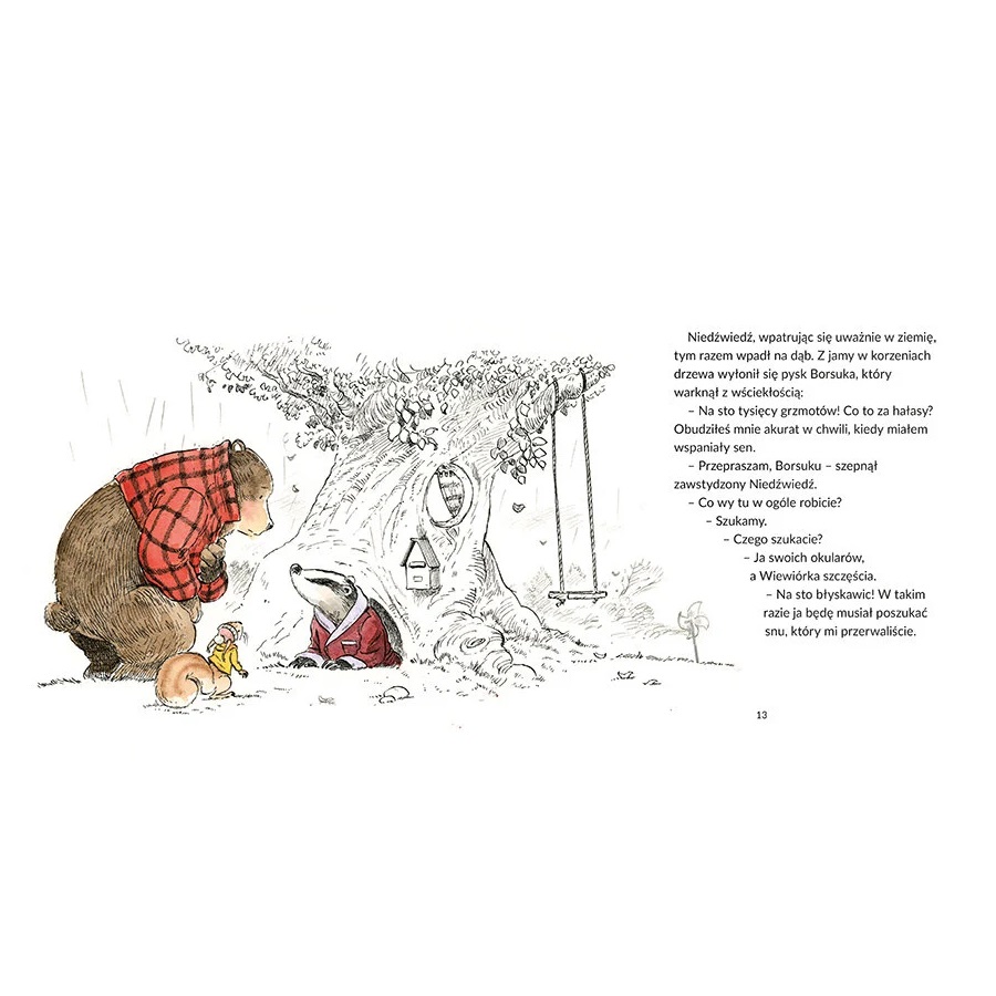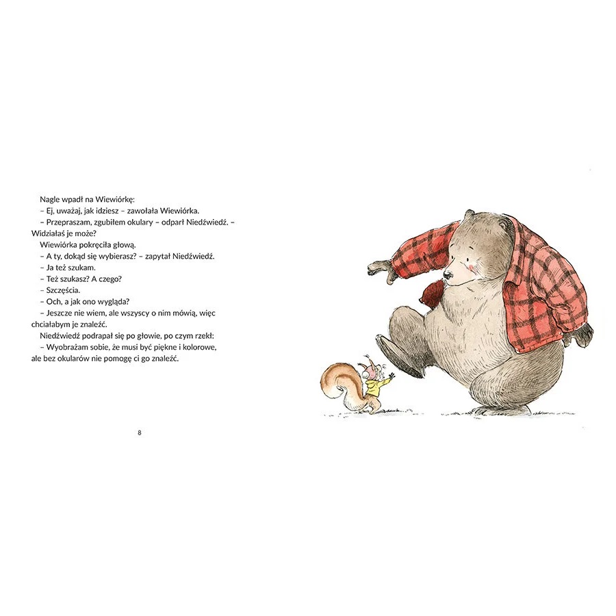 "A jak wygląda szczęście?", pyta Niedźwiedź. "Jeszcze nie wiem", odpowiada Wiewiórka, "ale wszyscy o nim mówią".