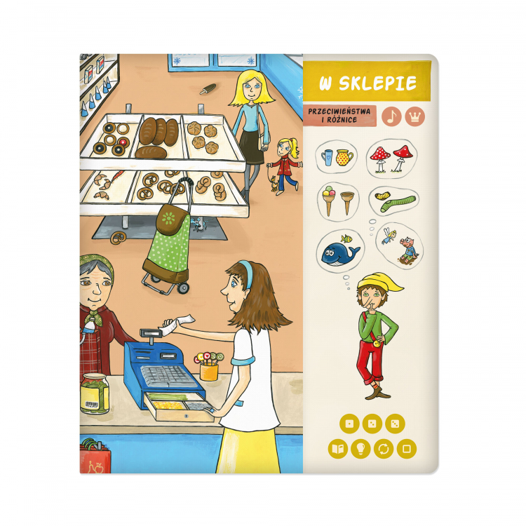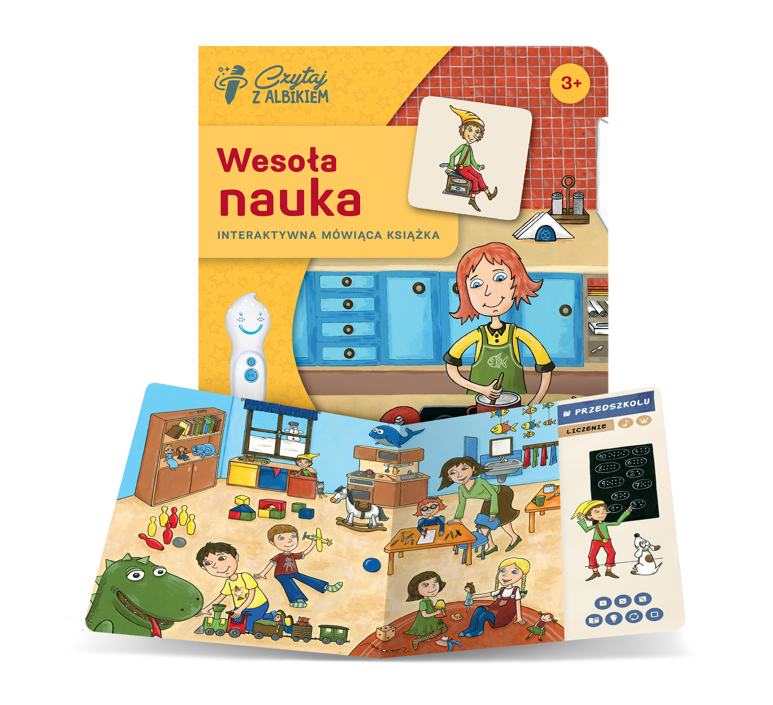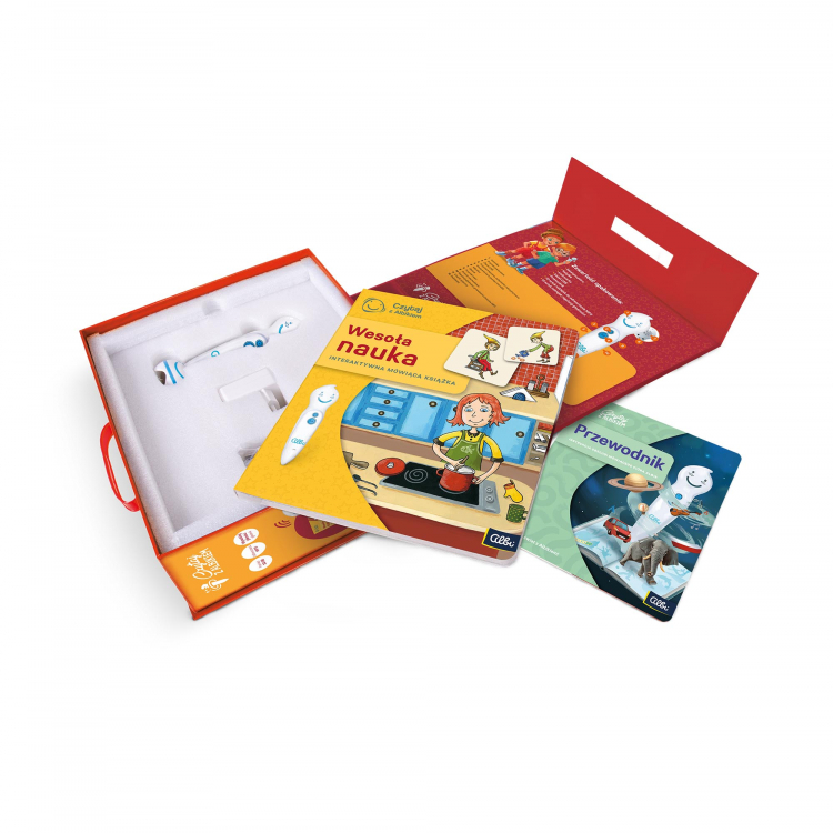 Dzięki zestawowi, w którym jest książka "Wesoła nauka" i pióro, dzieci w łatwy sposób poznają liczby, kolory, przeciwieństwa, pory dnia oraz części ciała. Razem z głównym bohaterem książki skrzatem, który przybył do ludzkiego świata, mały czytelnik zwiedzi dom, podwórko, sklep, teatr i przedszkole. W każdym rozdziale ma szansę nauczyć się wielu nowych rzeczy, zagrać w quiz, posłuchać piosenek i bajek.
