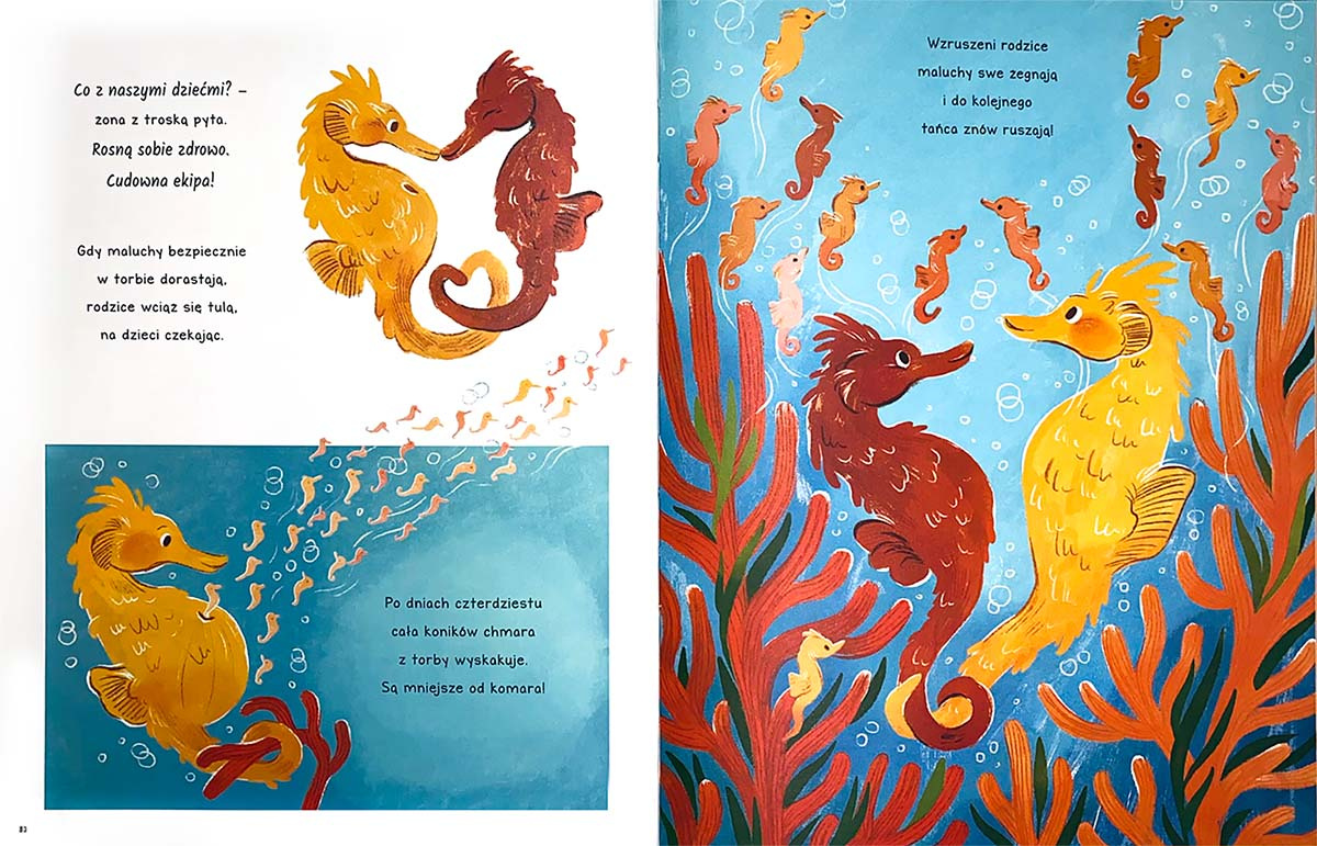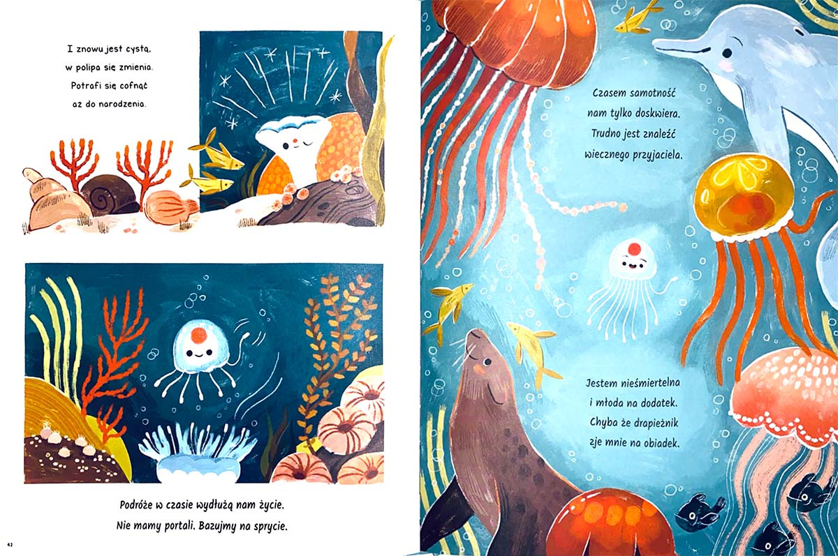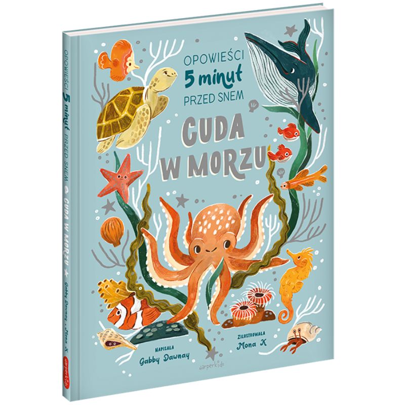 Współautorem polskiego przekładu jest znany przyrodnik i popularyzator nauki dr Mikołaj Golachowski, który czuwał również nad poprawnością merytoryczną książki. Młodzi czytelnicy dowiedzą się, jakie cuda kryją podmorskie głębiny i poznają ich rozmaitych mieszkańców: wieloryby, pingwiny, rekiny, koniki morskie, meduzy, żółwie, węgorze i ukwiały. Lektura każdej opowiastki zajmie nie dłużej niż pięć minut – idealnie nadaje się do wspólnego czytania przed snem, zwłaszcza, że podmorskim opowieściom towarzyszą wyjątkowo urocze, pastelowe ilustracje Mony K., które działają wyciszająco, ułatwiając dziecku odpoczynek.