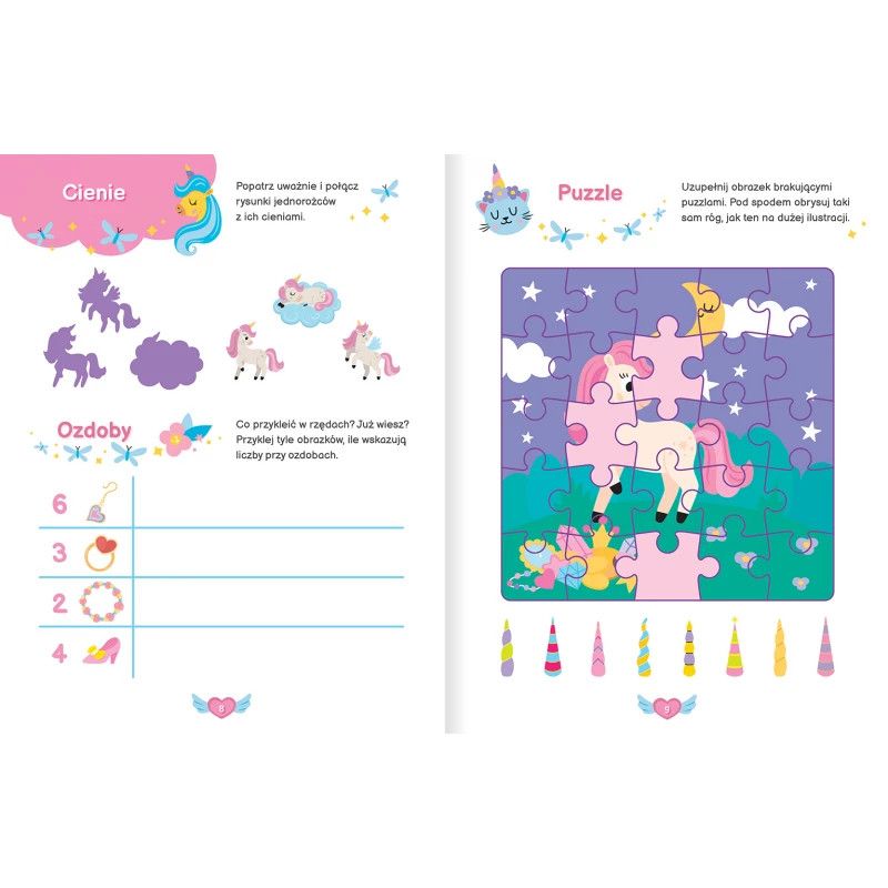 Jednorożce zapraszają dzieci do kolorowego, bajkowego świata pełnego łamigłówek, zagadek i kreatywnej zabawy z naklejkami. Ta wyjątkowa książka aktywizująca została stworzona z myślą o przedszkolakach, które uczą się poprzez działanie i odkrywanie. Starannie opracowane zadania rozwijają spostrzegawczość, logiczne myślenie oraz umiejętność skupienia uwagi, a jednocześnie w naturalny sposób zachęcają do nauki liczenia i ćwiczeń manualnych.