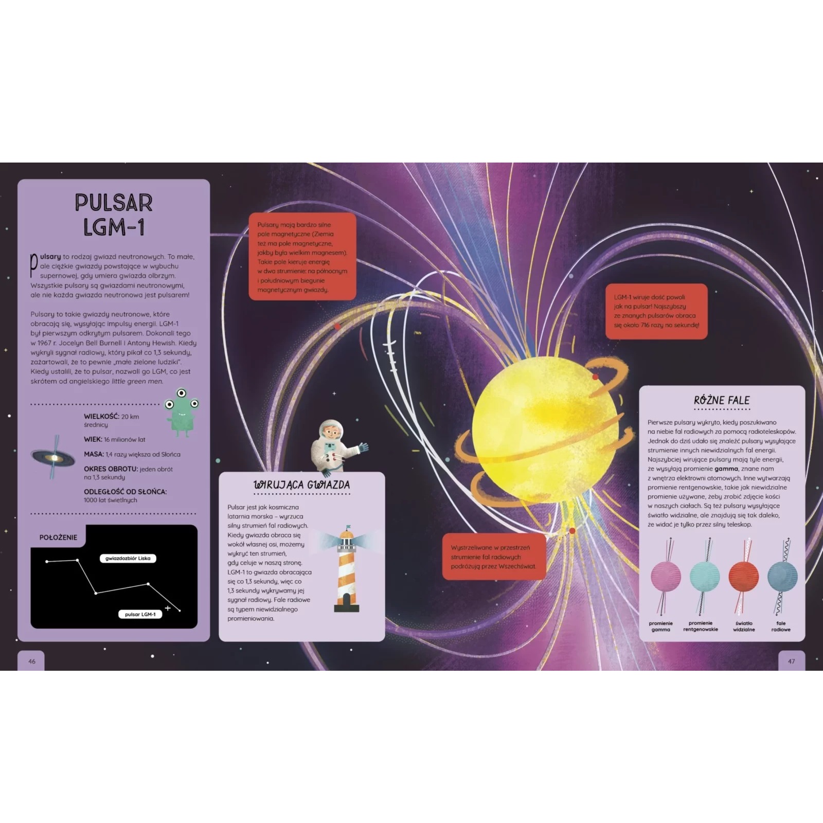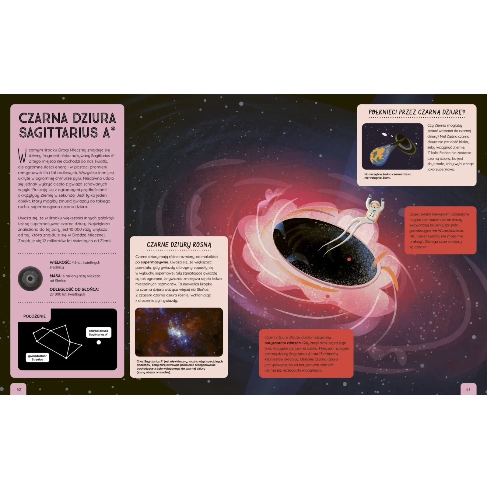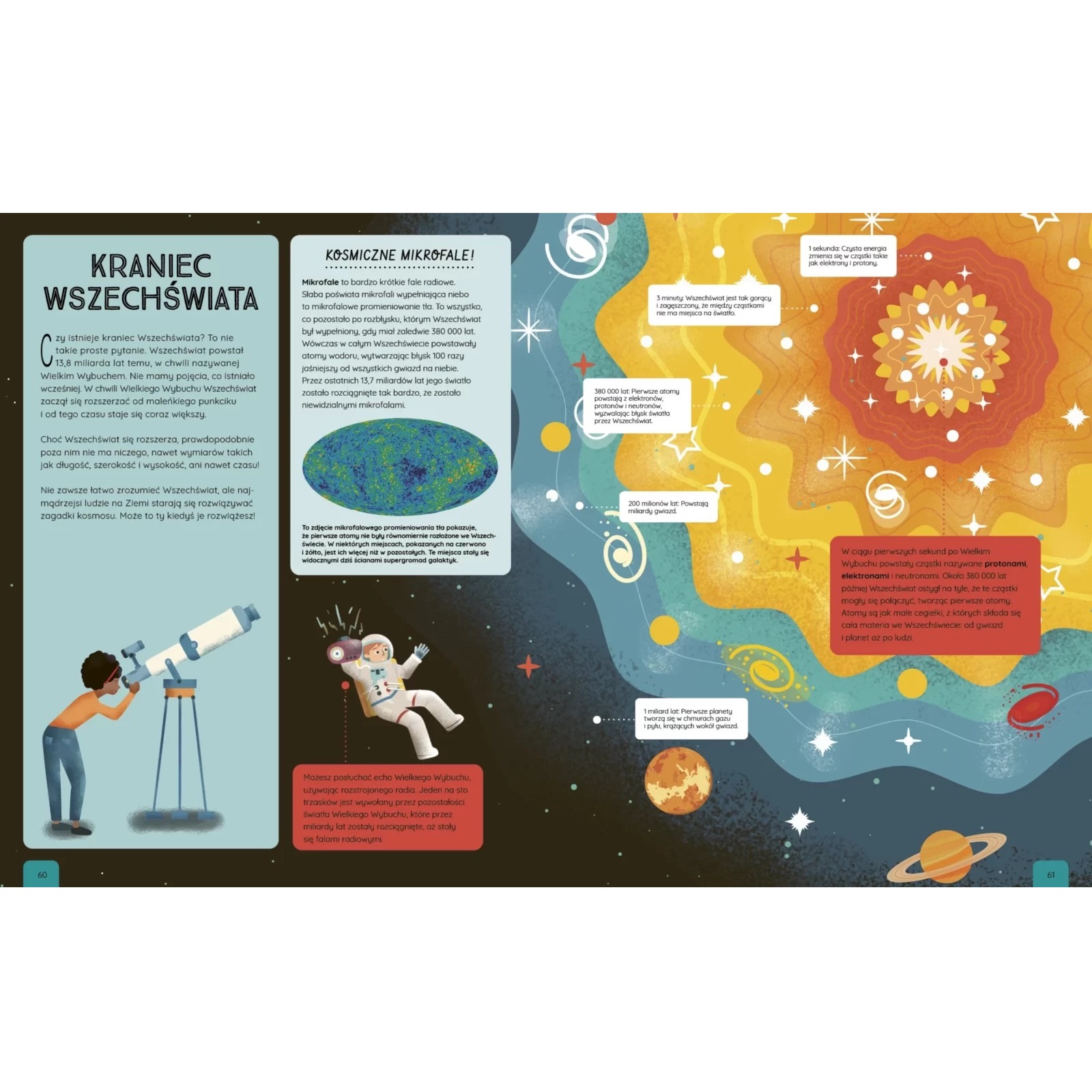 Z tej wyjątkowej książki dowiesz się wszystkiego, co chcesz wiedzieć o Wszechświecie, odbywając przy tym zapierającą dech w piersiach podróż przez gwiazdy. Znaczące miejsca w przestrzeni kosmicznej są dokładnie przedstawione dzięki oszałamiającym ilustracjom, zdjęciom kosmosu, zestawieniom interesujących faktów, diagramom i informacjom o osiągnięciach nauki.