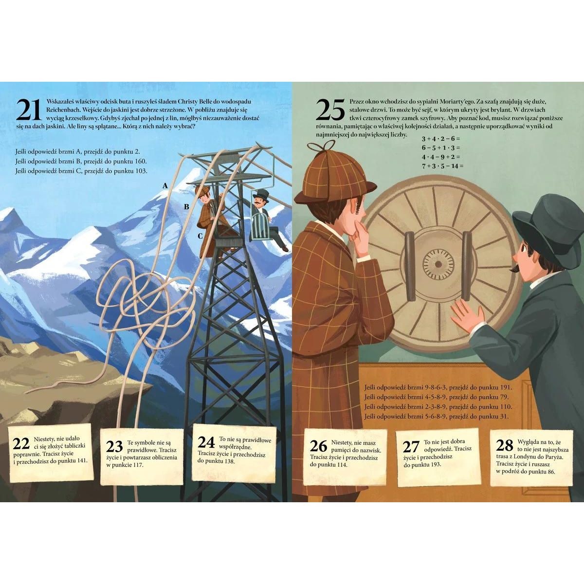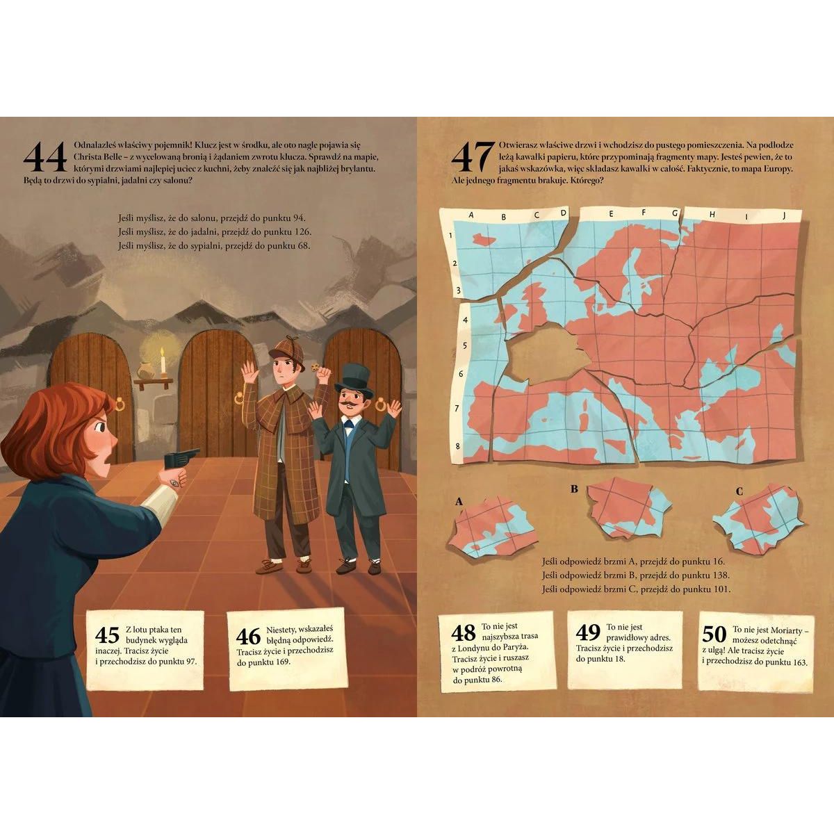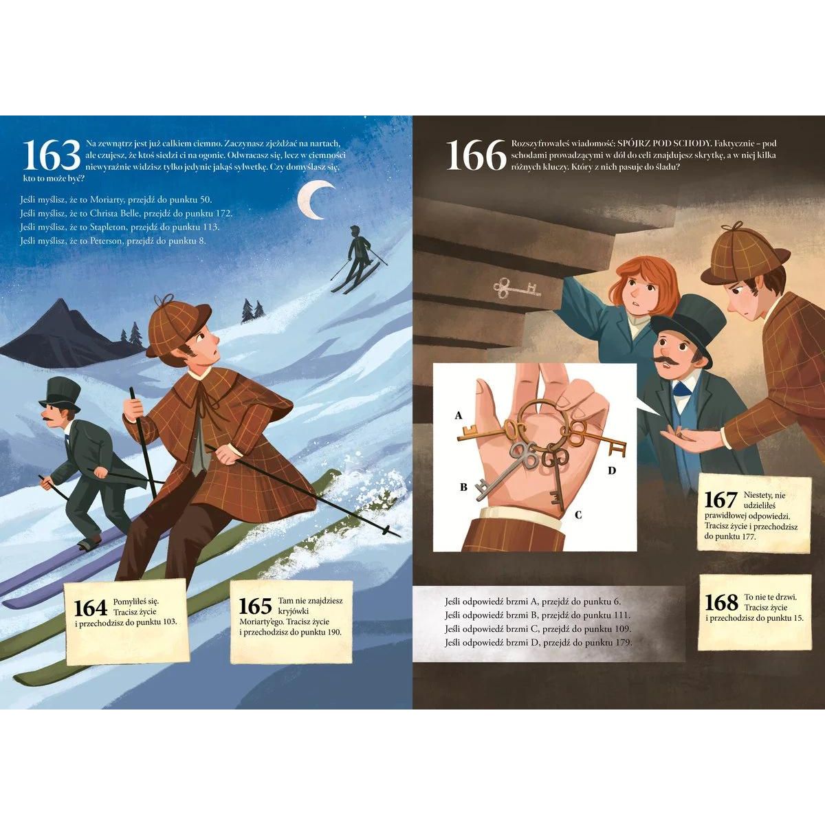 Młody czytelnik wciela się w postać najsłynniejszego detektywa, Sherlocka Holmesa, i rusza w pościg za nie mniej słynnym złoczyńcą - Moriartym, który ukradł bezcenny brylant. Aby odnaleźć skradziony klejnot, konieczne będzie rozwiązanie szeregu zagadek i poprawne wytypowanie odpowiedzi na różne pytania. Tylko wówczas jest szansa na złapanie przestępcy i odzyskanie drogocennego kamienia. Podczas tych ekscytujących poszukiwań młody czytelnik powinien wykorzystać wszystkie swoje zdolności - spostrzegawczość, umiejętność zapamiętywania i kojarzenia faktów oraz logiczne myślenie. Dobra zabawa i dreszcz rywalizacji gwarantowane!