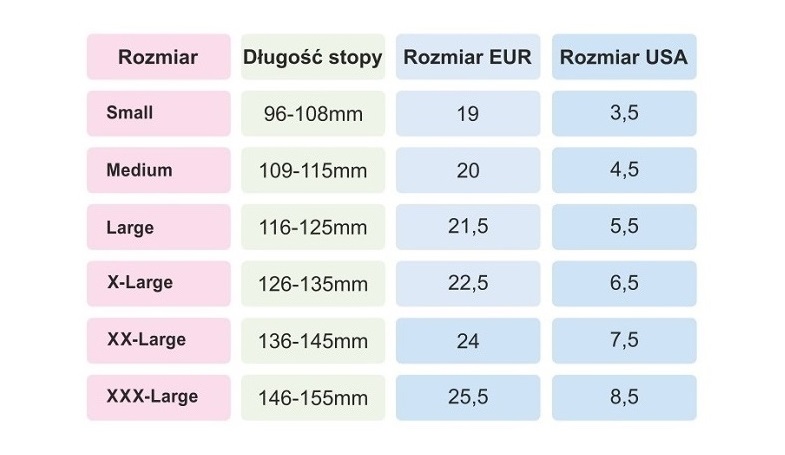 Kupując ten produkt decydujesz się na: rozmiar M - pasuje na stopę o długości 109-115 mm i odpowiada rozmiarowi EUR 20.