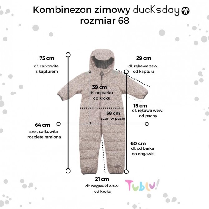 UWAGA! Kombinezony zimowe mają zawyżoną rozmiarówkę (są sporo większe niż wskazuje na to rozmiar). Prosimy sprawdzać wymiary. Na poniższym rysunku znajdują się dokładne wymiary kombinezonu.