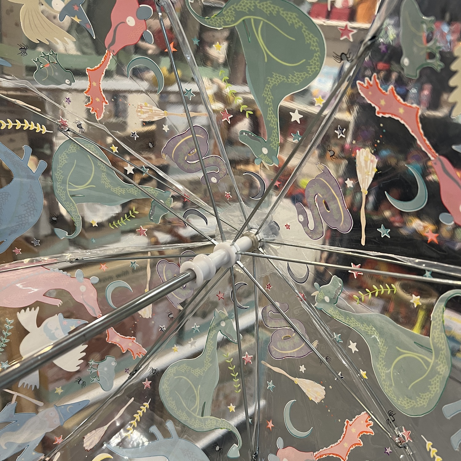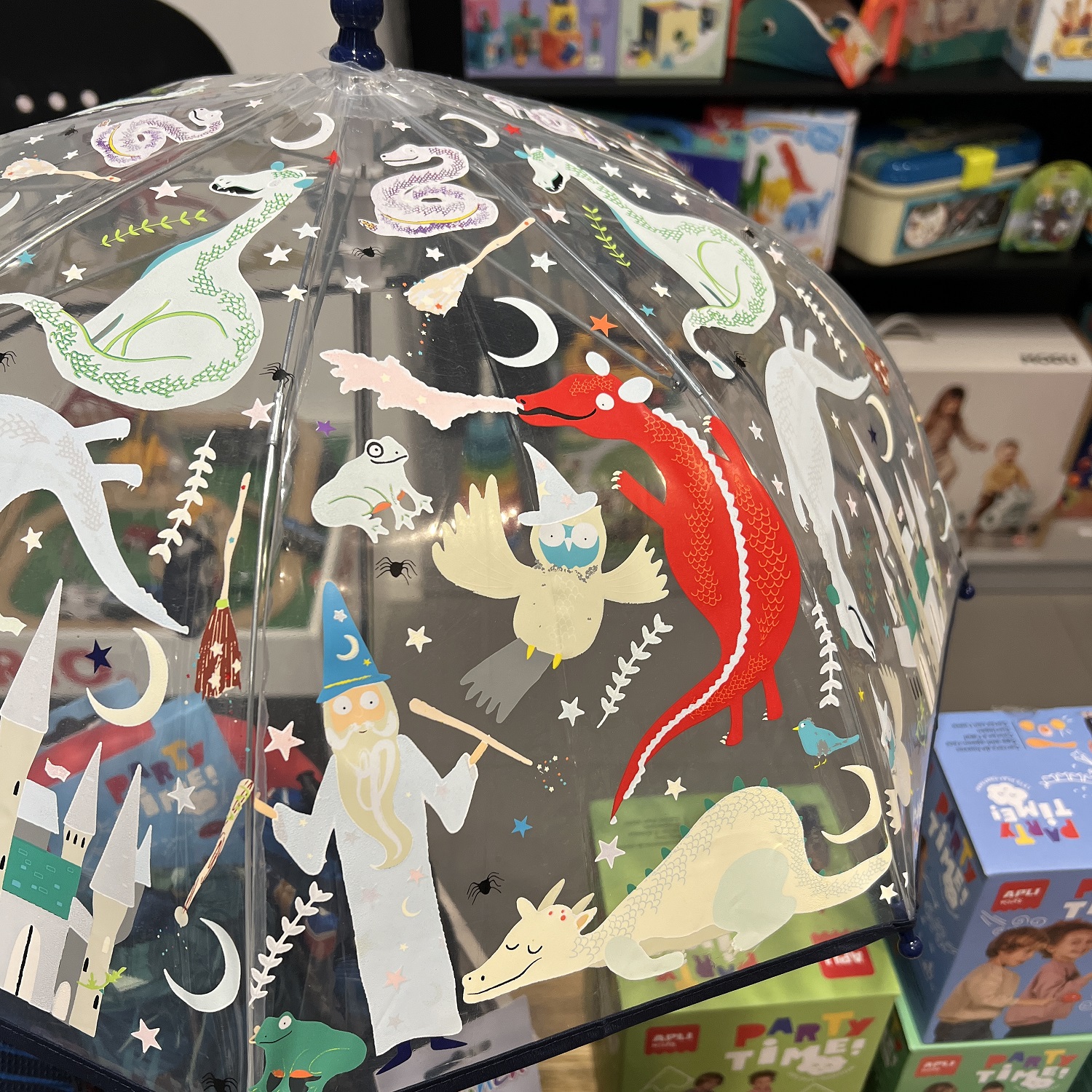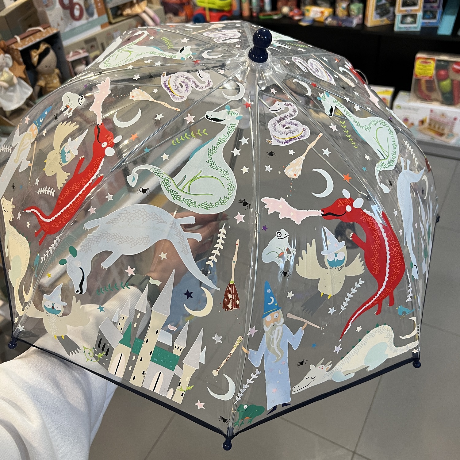 Twój maluch pokocha spacery w deszczu z magiczną parasolką zmieniającą kolory. Za każdym razem, gdy wyjdzie na deszcz białe kształty magicznie wypełnią się bajecznie kolorowymi motywami Zaczarowanego Zamku. Parasolka przyda się o każdej porze roku, a kolorowe smoki, czarodzieje z różdżkami, zamki, mądre sowy, magiczne mikstury i wiele innych, rozweselą nawet najbardziej pochmurny dzień. W komplecie wygodna rzepowa opaska zaciskowa do zabezpieczenia złożonej parasolki.
