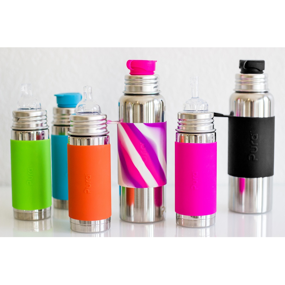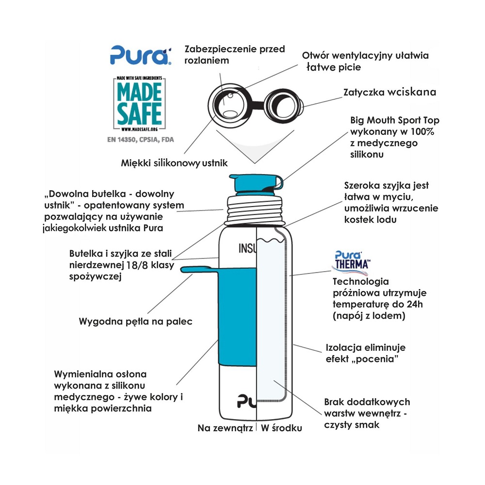 W standardowych butelkach czy bidonach elementy z tworzyw sztucznych przy podgrzaniu (np. w zmywarce lub kąpieli wodnej), ponacinaniu (nadgryzanie przez ząbkującego malucha) lub otarciach (rzucanie, pocieranie o twardy blat) uwalniają się szkodliwe toksyny. Jeżeli mamy wybór – wybierzmy lepsze i zdrowsze rozwiązanie. Zwykłym marnotrawstwem jest kupowanie za każdym razem nowej butelki, gdy dziecko podrośnie i pora przejść do kolejnego etapu w nauce karmienia i picia. Poza tym generuje to dodatkowe koszty. Wiele matek karmi swoje dzieci naturalnie, a butelek używa sporadycznie (wiele matek karmiących piersią musi dokarmiać swoje dzieci korzystając z butelek i sztucznego pokarmu). Dzieci nie zawsze akceptują wszystkie rodzaje smoczków dostępnych na rynku, dlatego też do butelki Pura można dopasować inne smoczki wiodących producentów. Wszystkie butelki Pura Kiki są poddawane procesowi elektropolerowania oraz piaskowania w celu wygładzenia powierzchni. Tak przygotowany produkt łatwiej jest utrzymać w czystości. Termobutelka nie jest produktem tożsamym z termosem. Jest to znakomita alternatywa dla tradycyjnych butelek czy bidonów doposażanych w dodatkowe opakowania termoizolacyjne. Największym atutem termobutelek jest ustnik za sprawą którego można pić bezpośrednio z butelki i nie trzeba przelewać płynu tak, jak w tradycyjnych termosach. W zależności od potrzeb należy sporządzić płyn w odpowiedniej temperaturze.