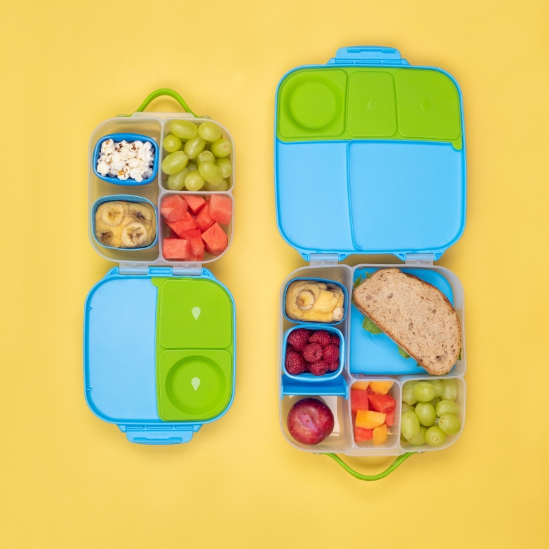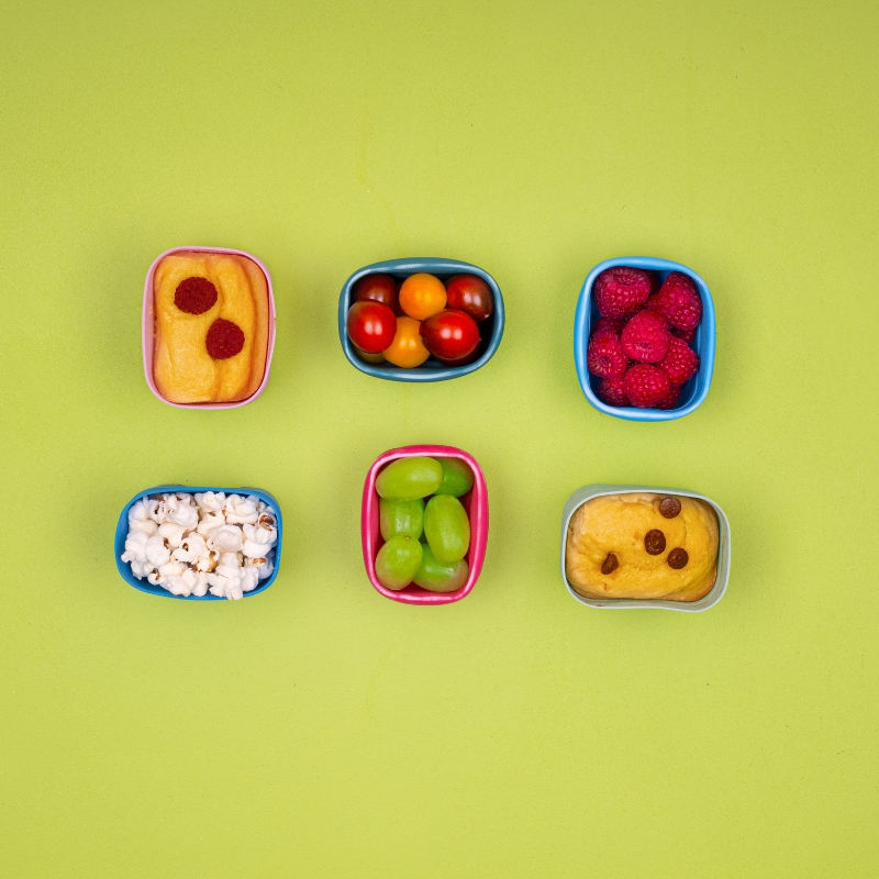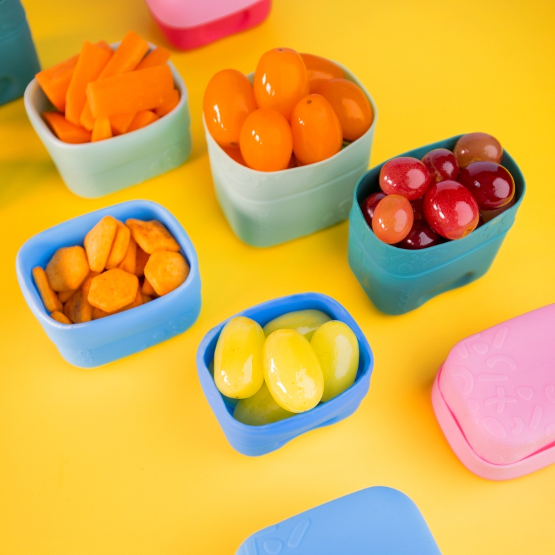 Zestaw silikonowych pojemników do lunchboxa i mini lunchboxa marki B. box. Są wszechstronne i posłużą jako dwa dodatkowe pojemniczki/przegródki na drobne przekąski, a złożone na siebie staną się kubkiem z pokrywką. Ich główną zaletą jest odporność na skrajne temperatury, więc bez problemu można je myć w zmywarce, używać w mikrofalówce, piekarniku i zamrażarce. Oddzielają od siebie i zapobiegają zmieszaniu pokarmów o różnej konsystencji i składzie.