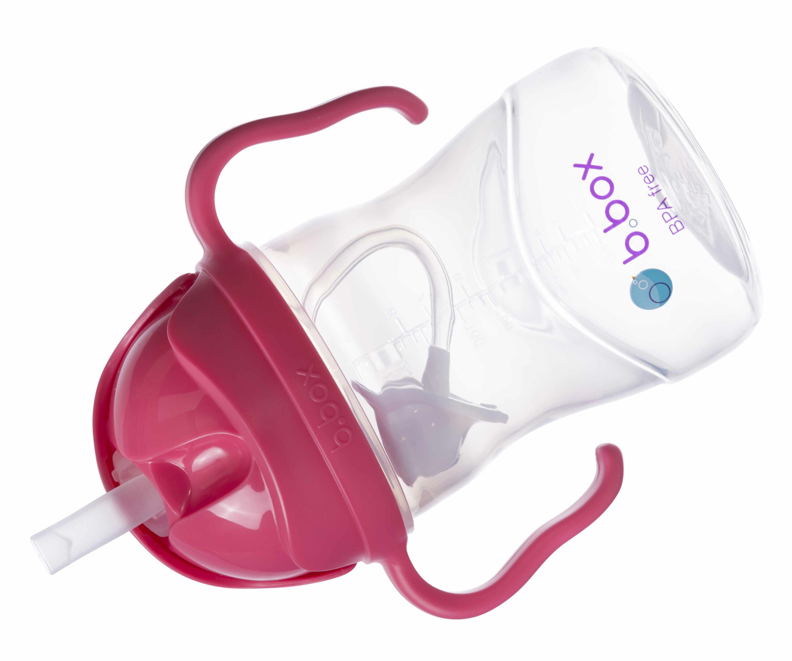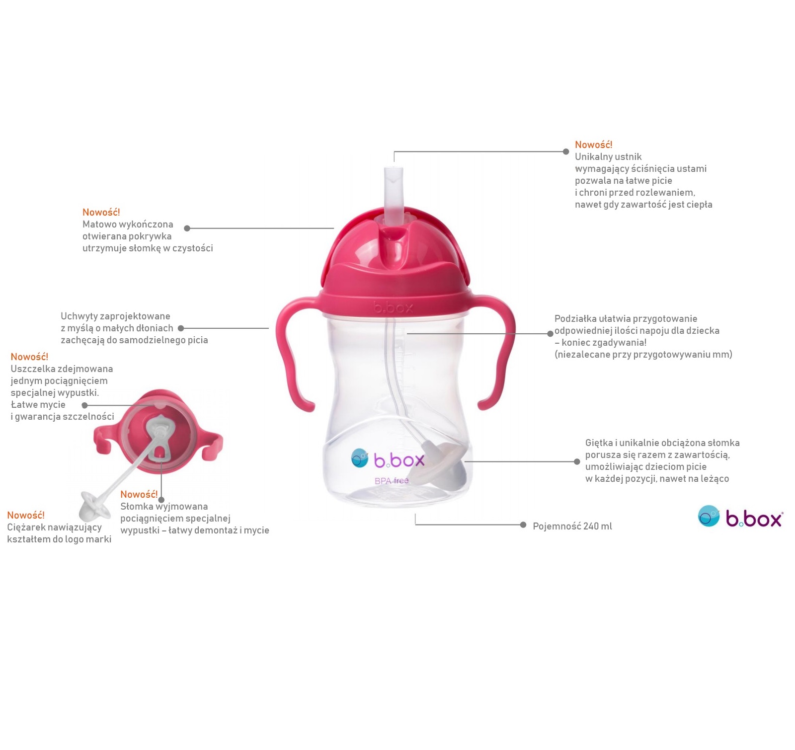 Dziecko ma możliwość picia z kubeczka w dowolnej pozycji, a wszystko dzięki małemu ciężarkowi znajdującemu się na końcu słomki, który swobodnie porusza się wraz ze słomką i płynem niezależnie od kąta nachylenia kubka. Specjalnie zaprojektowana słomka z dwukierunkowym zaworem chroni przed rozlewaniem - a więc picie bez dodatkowego bałaganu. Ławy do otwierania - większość dzieci radzi sobie spokojnie z otwieraniem i zamykaniem klapki. Ma też wygodne uchwyty do trzymania. Kubek B.Box charakteryzuje się wyjątkową trwałością i odpornością na uderzenia, co sprawia, że jest praktycznie niezniszczalny.