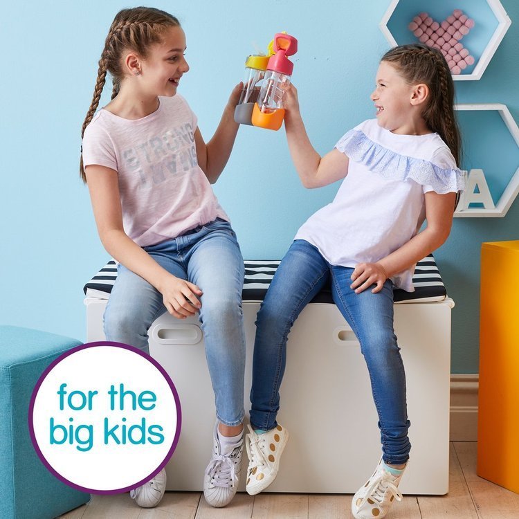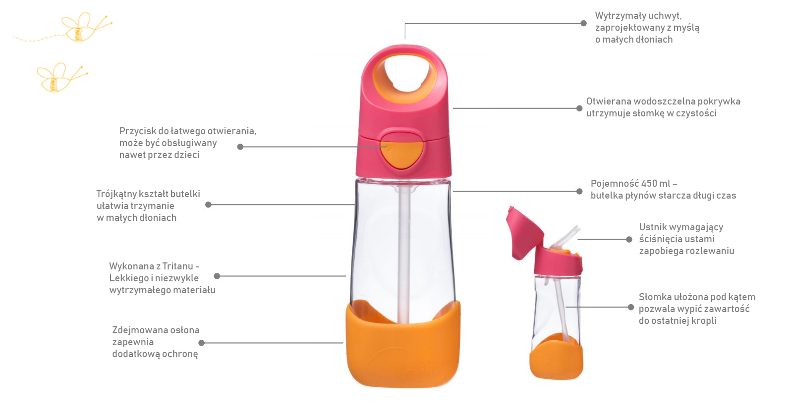 Wykonana z trwałego tritanu butelka ze słomką sprawdzi się do przedszkola i szkoły. Kształt trójkąta ułatwia trzymanie butelki, a specjalna silikonowa słomka jest ustawiona pod kątem, co pozwala wypić napój do końca. Butelka jest szczelna. Posiada zintegrowane zamknięcie na przycisk, które zapewnia wygodę i zabezpiecza przed rozlaniem, zabrudzeniem słomki lub zgubieniem nakrętki.