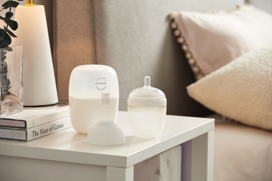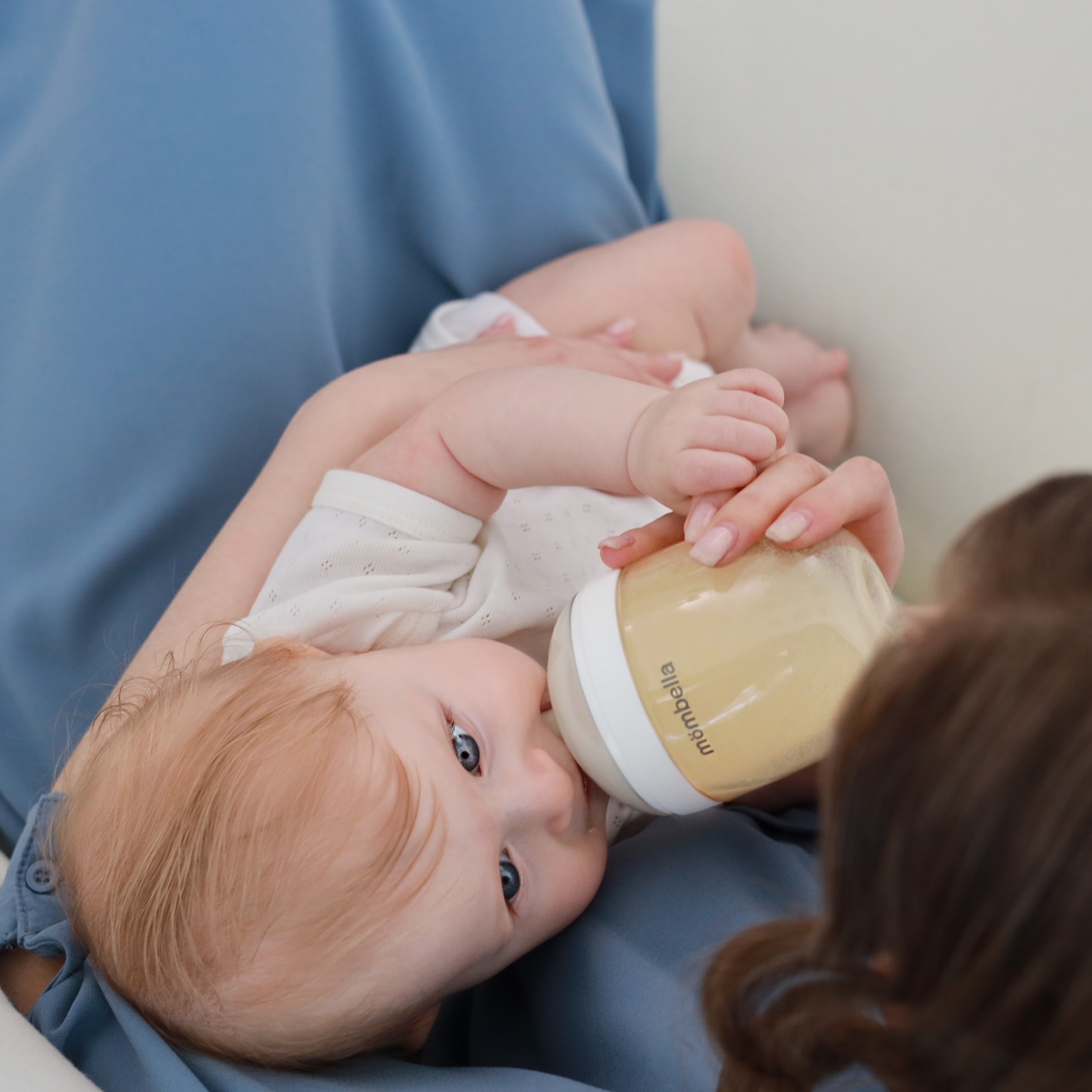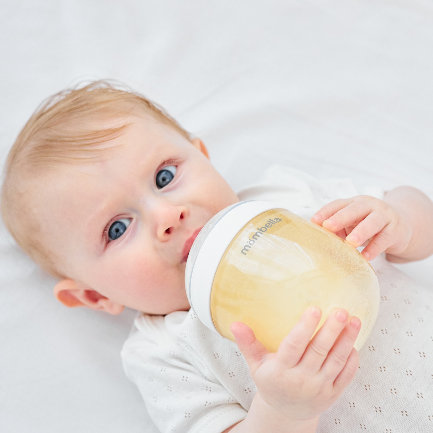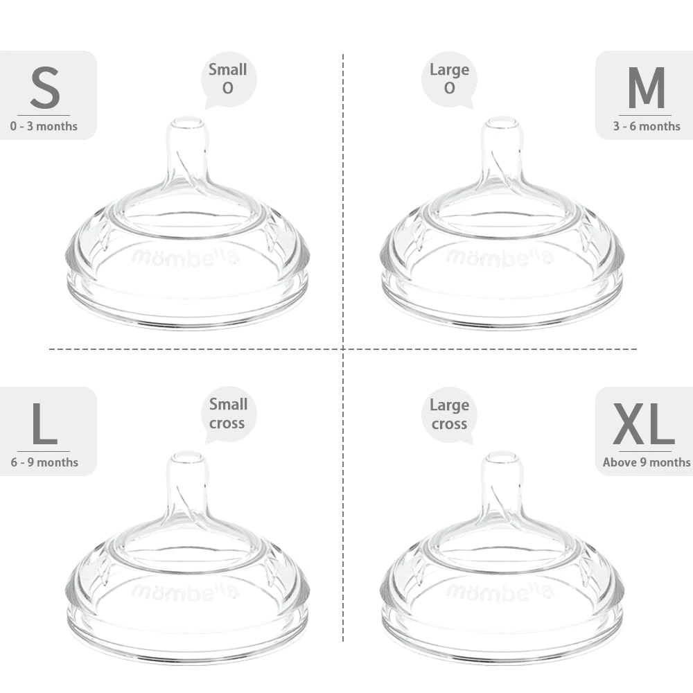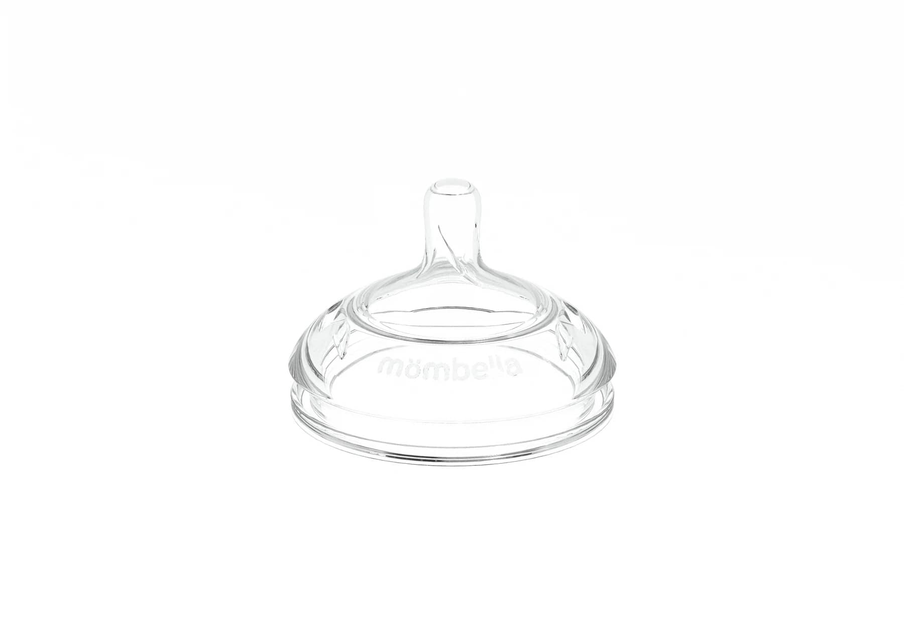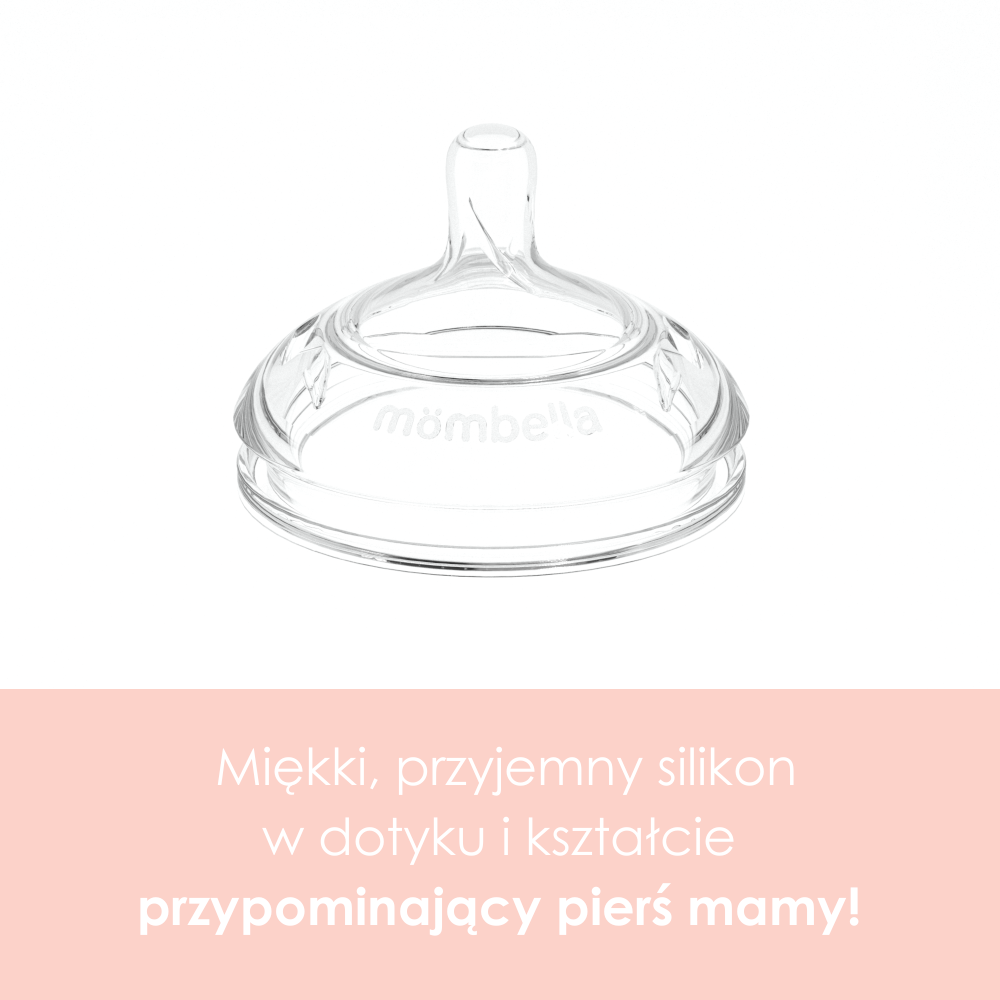Smoczek w butelkach antykolkowych Mombella swym dużym, okrągłym kształtem przypomina pierś mamy. Wykonano go z miękkiego, przyjemnego w dotyku, a przy tym naturalnie higienicznego silikonu, który swą strukturą zbliżony jest do skóry mamy. W ten sposób niemowlę doświadcza znajomej bliskości, jest mniej nerwowe, a dzięki temu łatwiej jest mu się nauczyć picia z butelki.