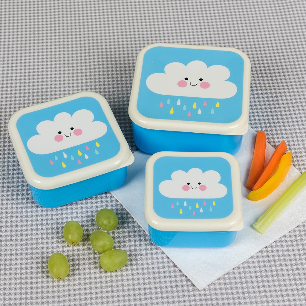 Komplet trzech pudełek na przekąski na spacer, w podróż, do przedszkola lub na piknik. Każde pudełeczko z przyjemnym dla oka dziecięcym wzorem.
