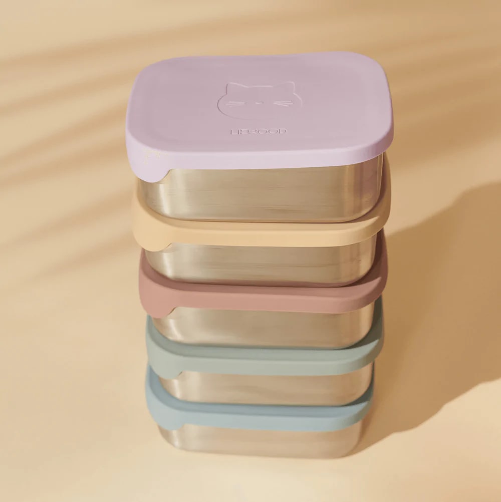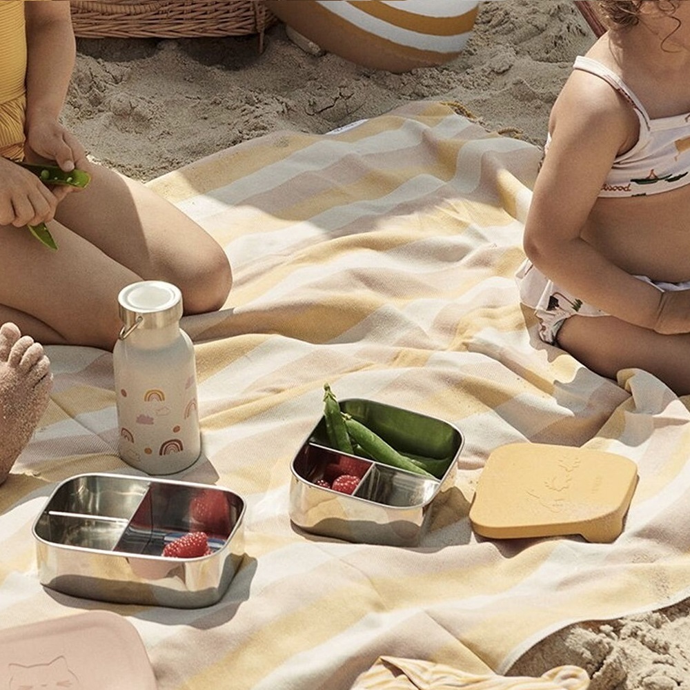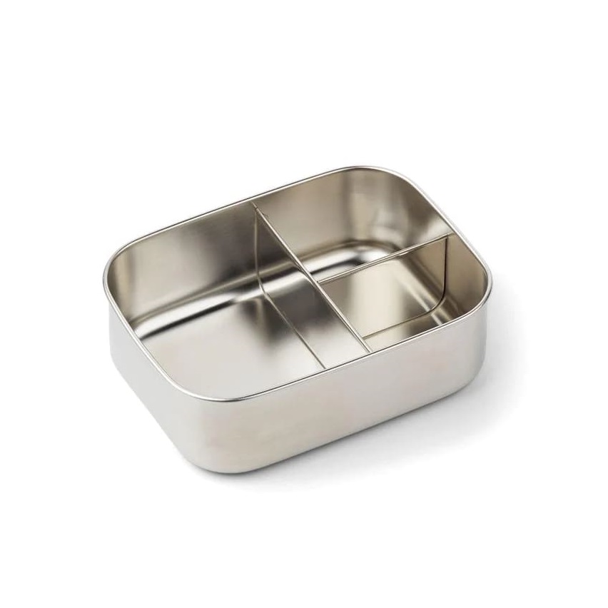 Lekki lunchbox ze stali nierdzewnej marki Liewood z uroczą silikonową pokrywką. Posiada trzy wygodne przegródki, dzięki którym można rozdzielić podawane produkty. Stal nierdzewna świetnie nadaje się do przechowywania żywności, ponieważ nie odbarwia się, nie zatrzymuje zapachów i jest oczywiście bardzo trwała. Lunchbox Arthur doskonale sprawdzi się jako pojemnik do przedszkola czy szkoły.
