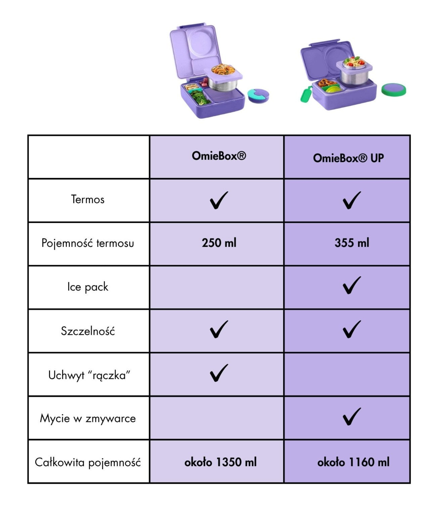 OmieBox to szczelny lunchbox z przegródkami dla dzieci wyposażony dodatkowo w wyjmowany termos obiadowy, podtrzymujący temperaturę przez około 3-4 godziny, który umożliwia przenoszenie ciepłych i zimnych dań jednocześnie.