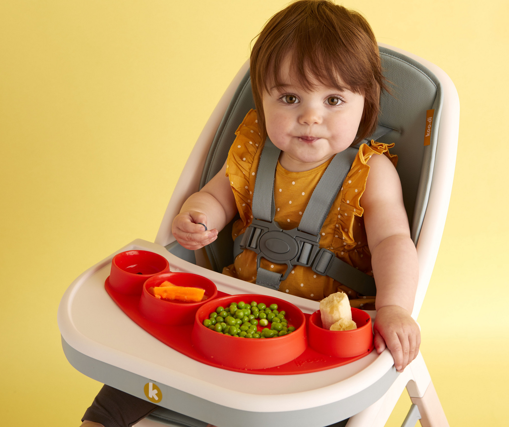 Silikonowy talerz Tiny Tapas Koo-di został tak zaprojektowany, aby uławić dziecku naukę samodzielnego jedzenia. Podwyższony brzeg z tyłu pomaga przy nabieraniu jedzenia łyżką lub widelcem. Talerzyk Koo-di to świetny wybór przy stosowaniu metody BLW, kiedy do diety wprowadzany jest stały pokarm. Wykonany jest z antypoślizgowego silikonu, który zapobiega jego przesuwaniu się podczas jedzenia oraz zrzuceniu. Dodatkowo posiada 4 przegródki, które rozdzielają żywność. Pasuje do większości krzesełek do karmienia.