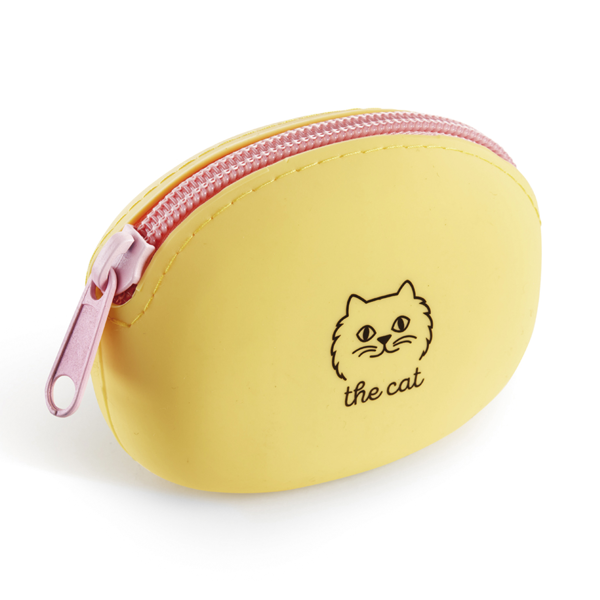 Silikonowy portfelik w kolorze żółtym z nadrukiem kotka idealnie sprawdzi się do przechowywania monet bądź małych skarbów. Posiada jedną komorę główną zamykaną na suwak.