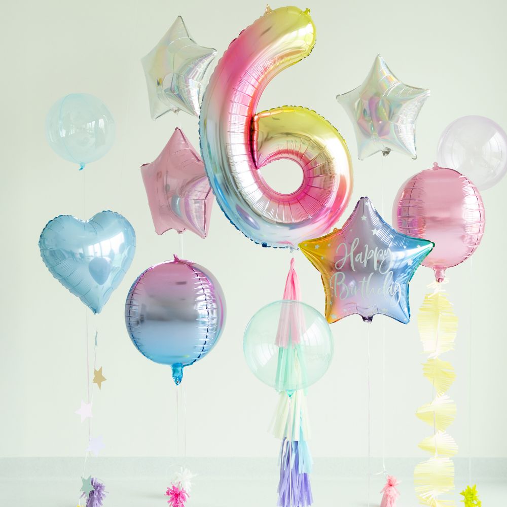Balon foliowy Cyfra "6" w kolorze pastelowy tęczowy. Świetnie sprawdzi się jako dekoracja na urodzinowym przyjęciu.