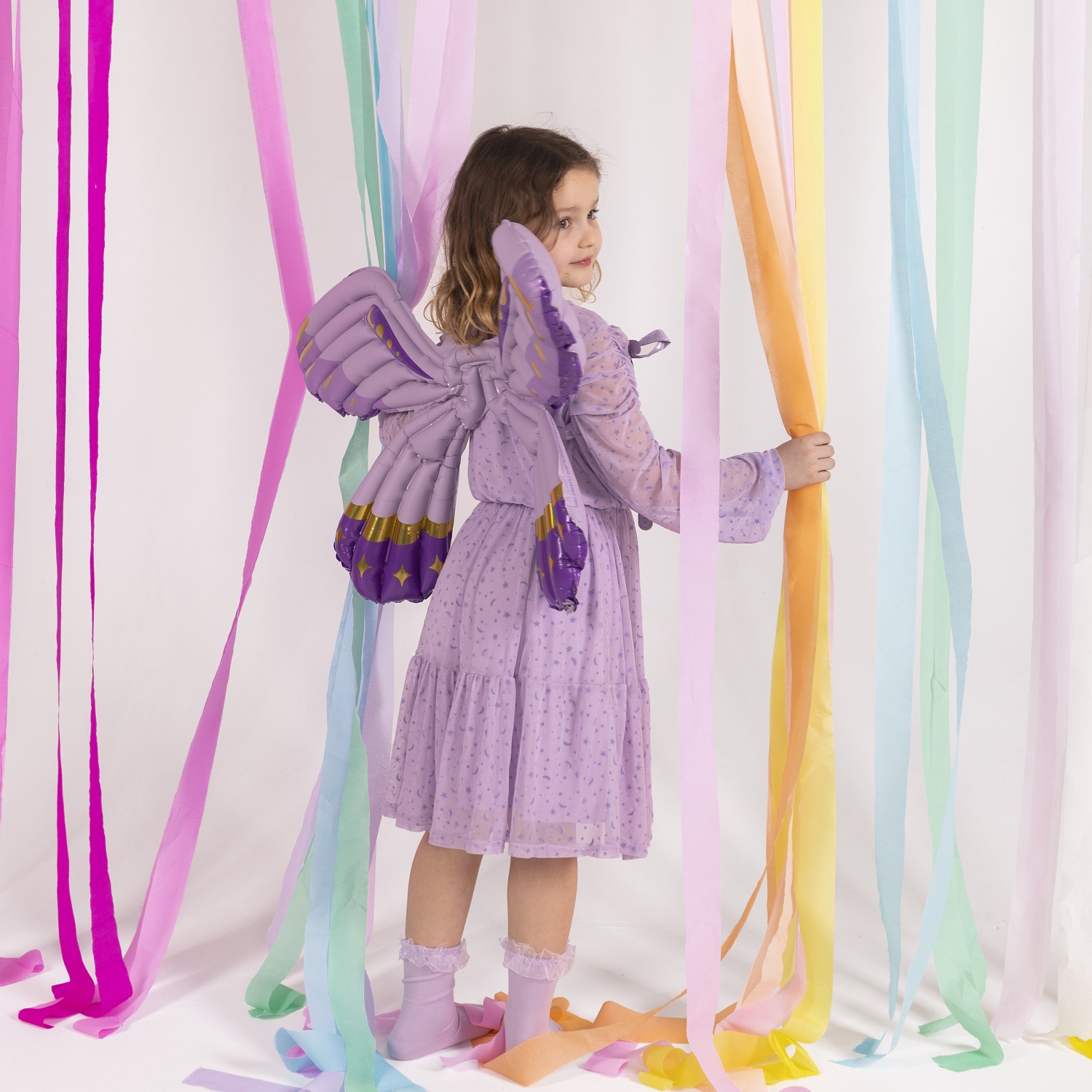 Ten wyjątkowy balon foliowy w kształcie skrzydeł motyla to idealny dodatek na różnego rodzaju imprezy i zabawy. Jego matowy, fioletowy kolor przyciąga wzrok i dodaje uroku. Dzięki dołączonym sznurkom, balon można łatwo przymocować do pleców, tworząc efektowny strój motyla. W zestawie znajduje się również słomka, która ułatwia napompowanie balonu powietrzem.