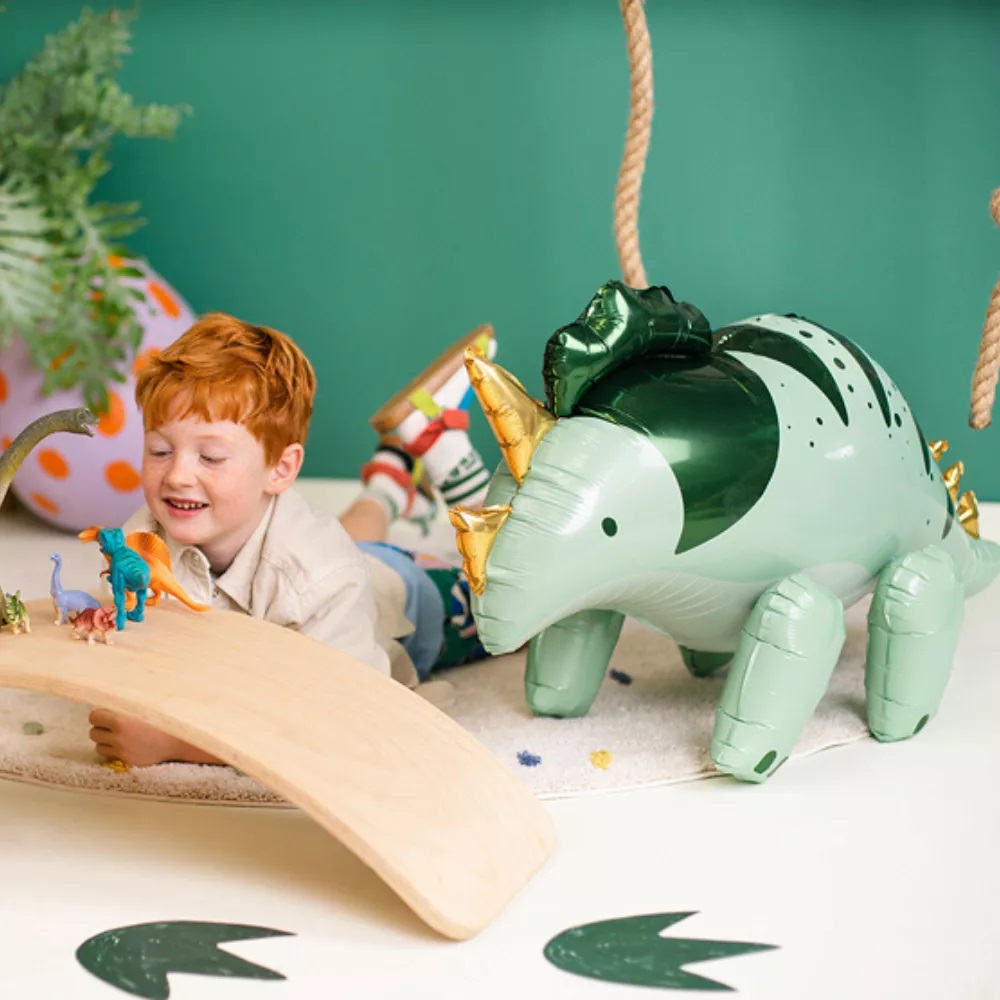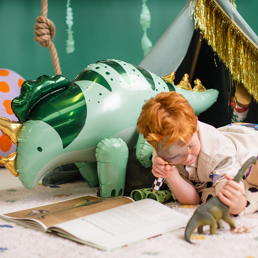 Stojący balon foliowy Triceratops to nie tylko dekoracja to sposób, żeby przemienić urodziny dziecka w prawdziwą przygodę.