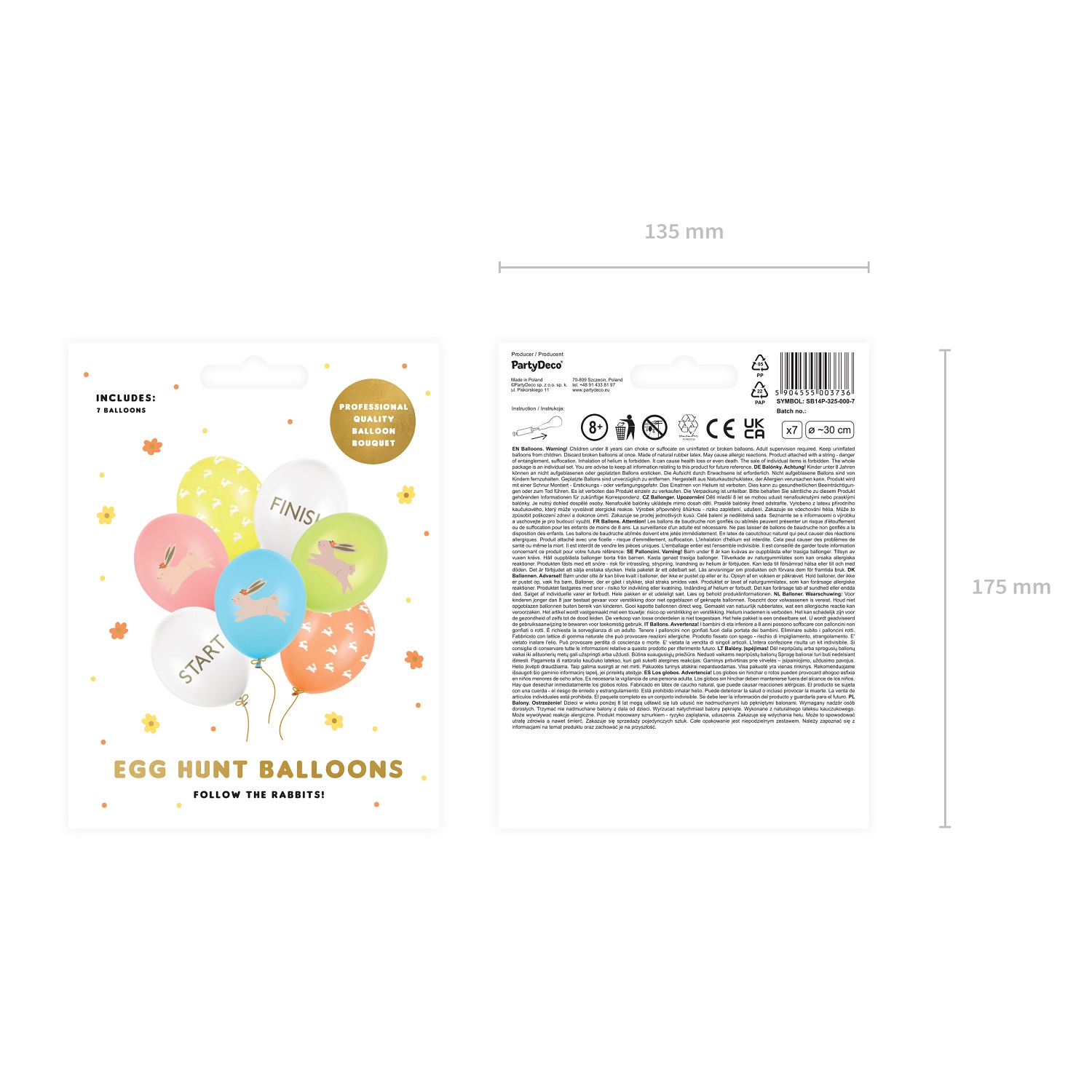 Na białych balonach widnieją napisy "START" i "FINISH", co sugeruje, że mogą one służyć do oznaczenia początku i końca trasy poszukiwań. Pozostałe balony są ozdobione grafiką przedstawiającą małe, białe zajączki, dodając im uroku i nawiązując do tematyki Wielkanocy.