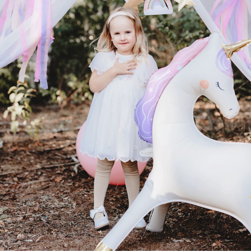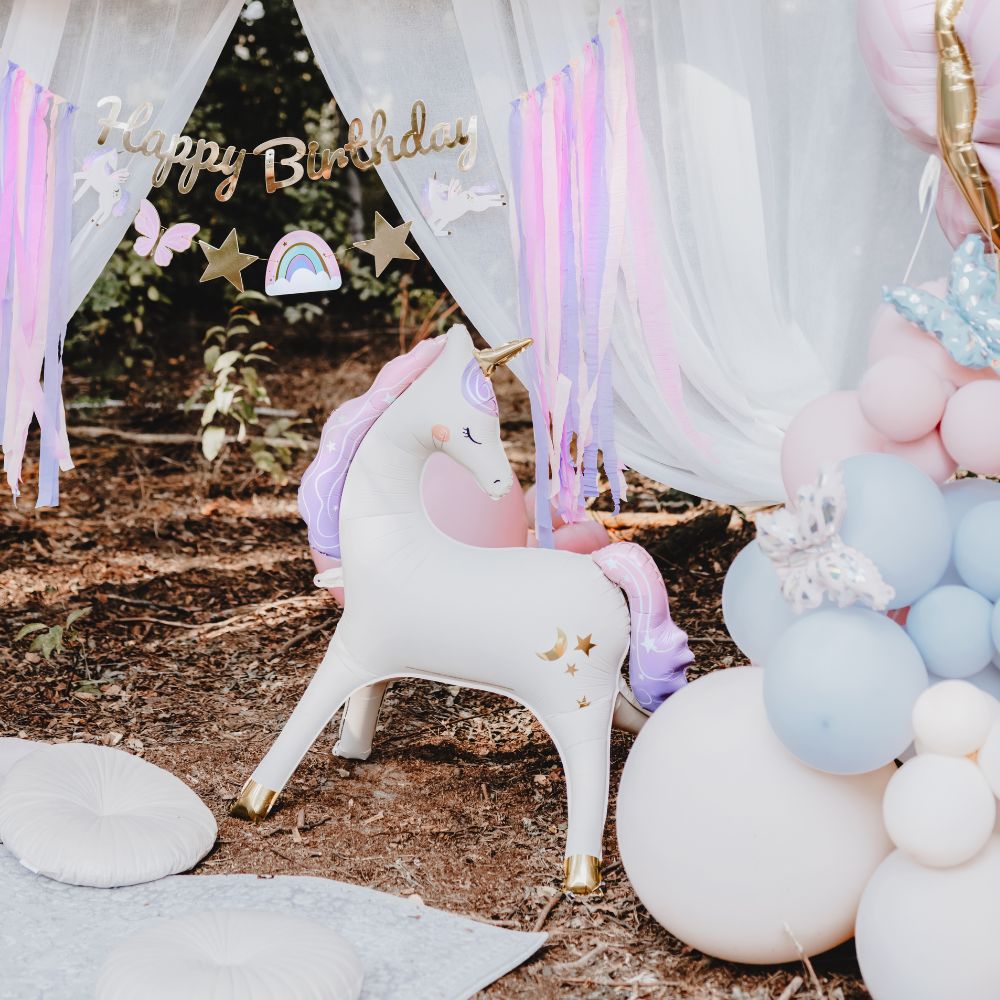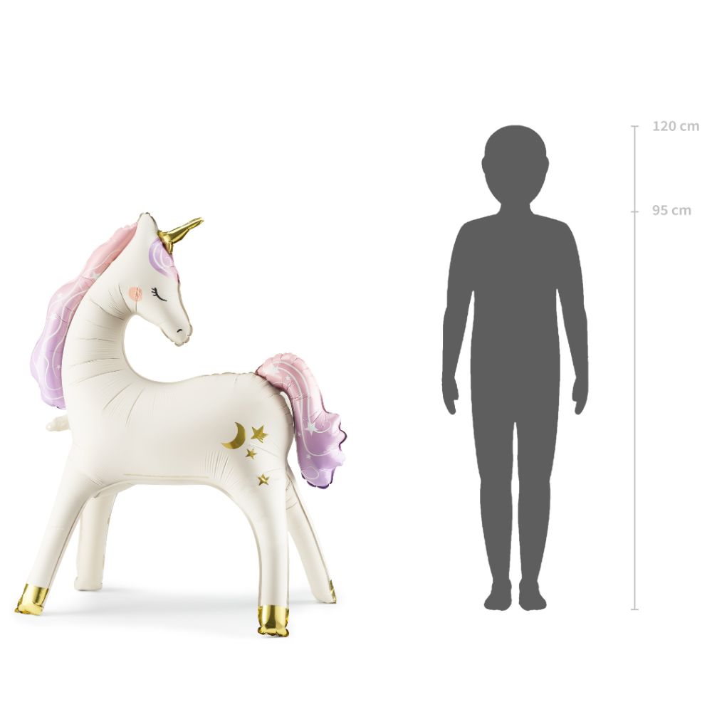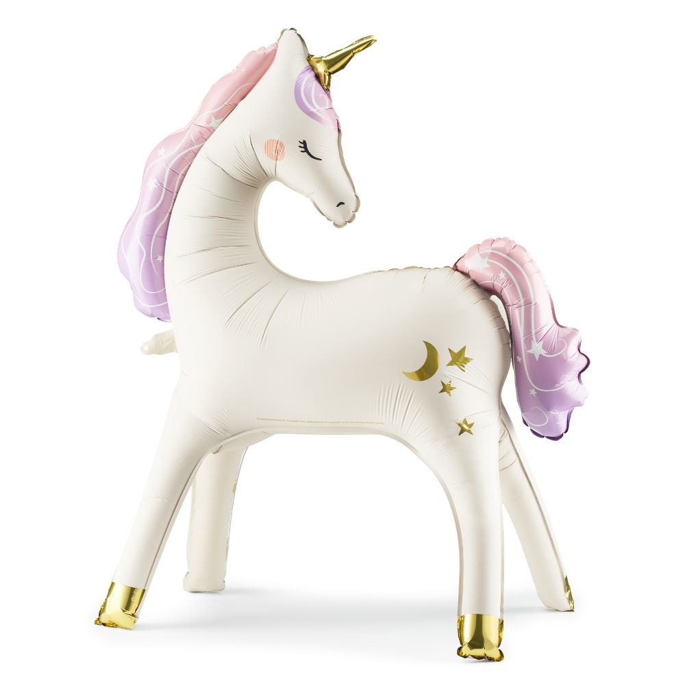 Stojący balon foliowy w kształcie jednorożca to efektowna dekoracja na każdą okazję. Wykonany z wysokiej jakości folii. Do napompowania powietrzem. W zestawie znajduje się słomka ułatwiająca pompowanie. Idealny na przyjęcia tematyczne, urodziny i inne uroczystości.