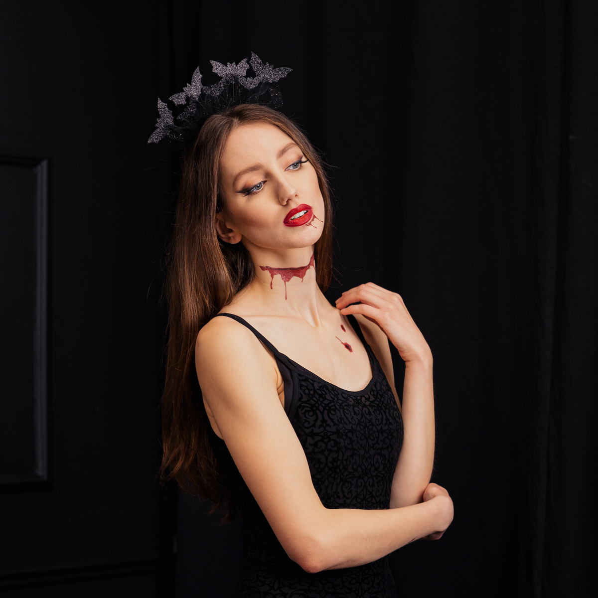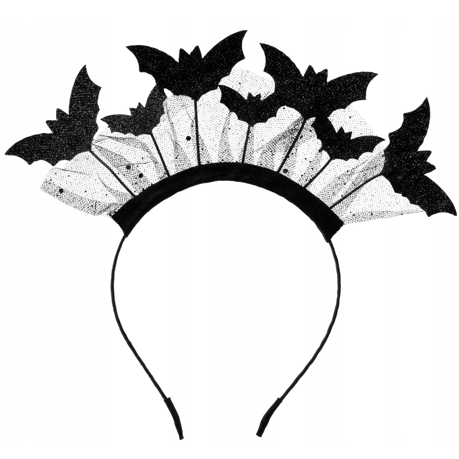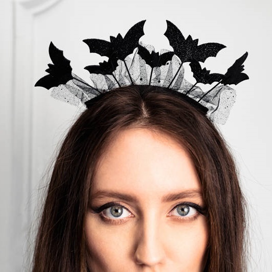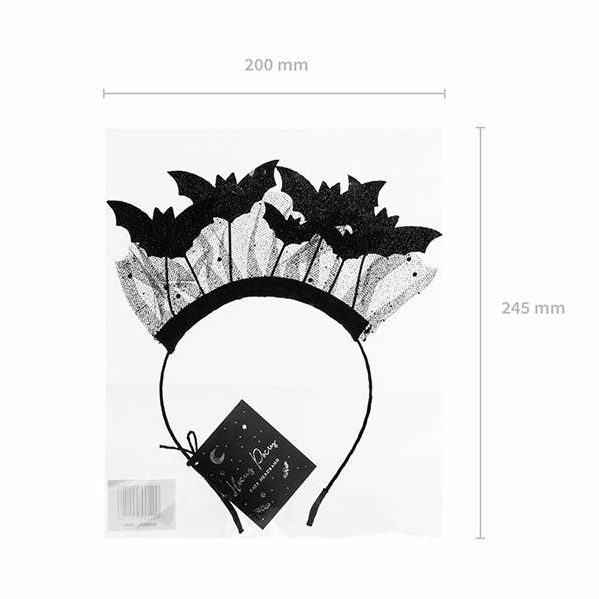 Opaska nietoperze w kolorze czarnym z przyklejonymi nietoperzami oraz kawałkiem czarnej koronki. Idealny gadżet na imprezę Halloween lub też uzupełnienie stroju Nietoperza. Sprawdzi się idealnie także do sesji zdjęciowych.