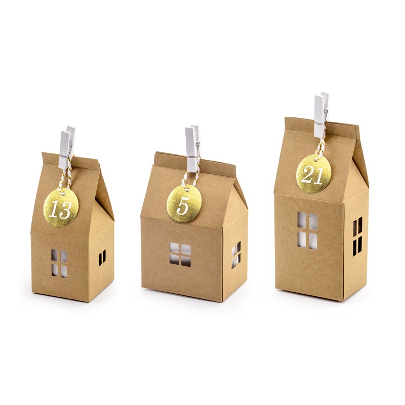 Kalendarz adwentowy Domki, zestaw zawiera: 3 wzory papierowych domków w kolorze kraft, po 8 z każdego wzoru (wymiary: od ok. 5 x 11 x 5 cm do ok. 7 x 11 x 5 cm), 24 drewniane klamerki w kolorze białym (wysokość ok. 3,5 cm), złote papierowe zawieszki z nadrukowanymi białymi cyframi od 1 do 24 (średnica ok. 3 cm), 24 kawałki białego sznurka ze złotą nitką (długość ok. 20 cm) oraz 24 białe bibułki we wzór złotych kropek (wymiary: ok. 15 x 21 cm).