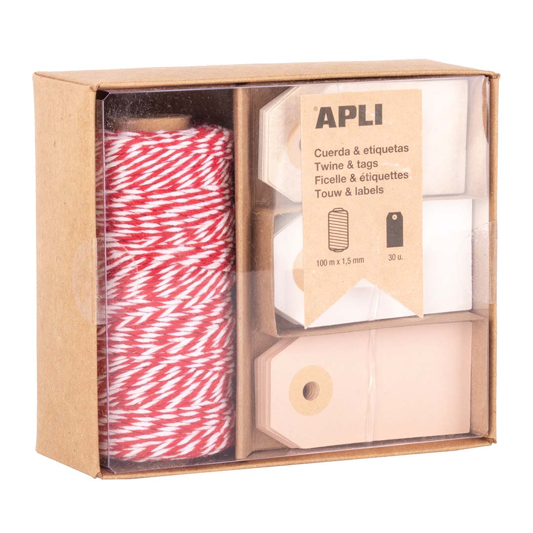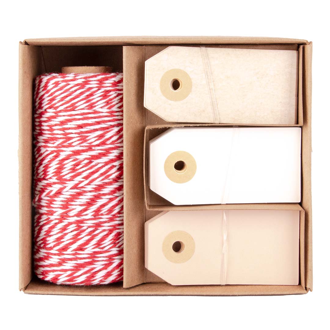 Zestaw do dekoracji prezentów zawiera bawełniany sznurek w kolorze czerwono-białym o długości 100 metrów oraz 30 kolorowych zawieszek (beżowe, białe, kremowe). Idealny do tworzenia eleganckich i kreatywnych opakowań na prezenty.