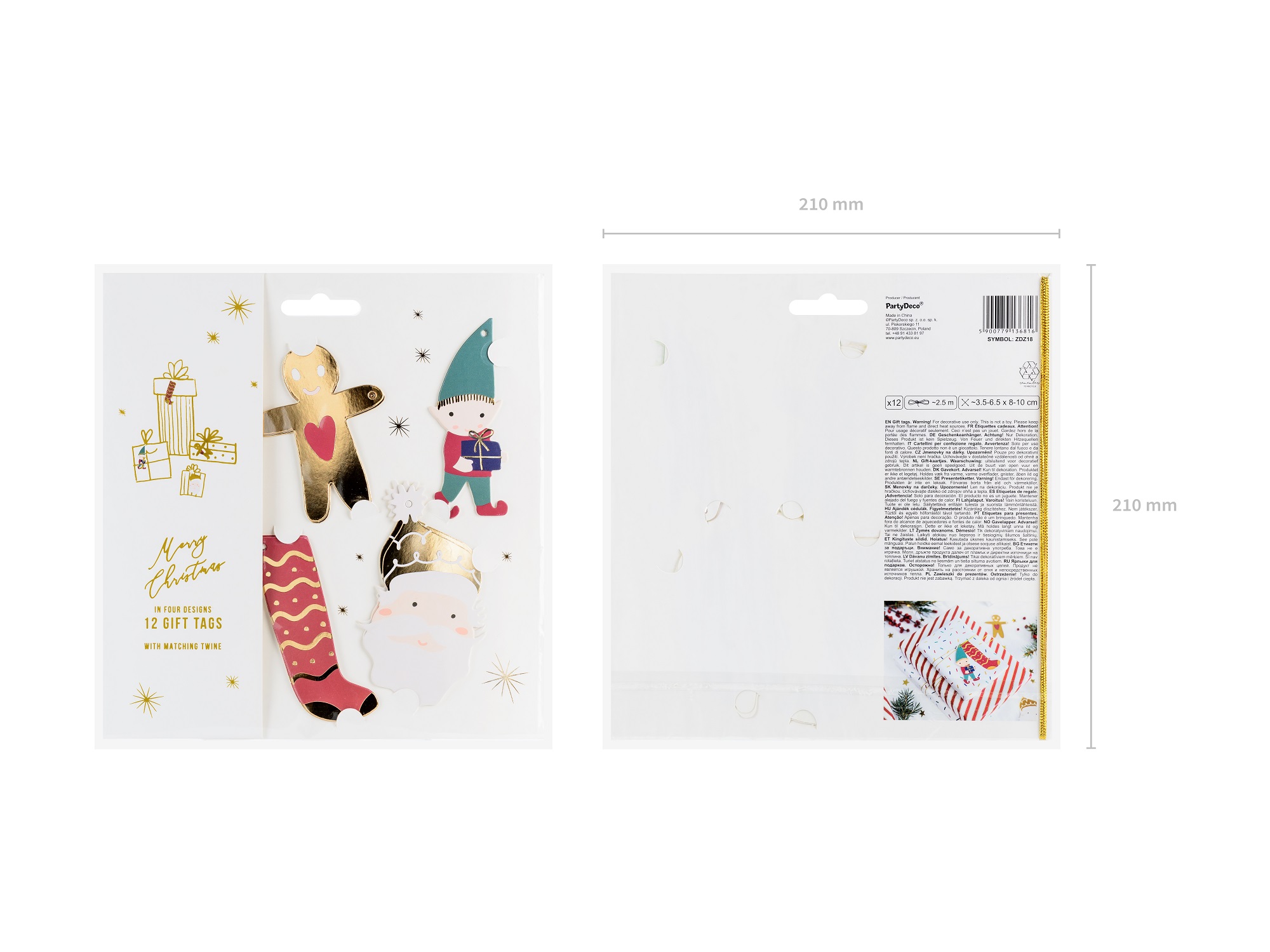 Zawieszki do prezentów Mikołaj wykonane z papieru. Doskonale sprawdzą się do oznaczania i identyfikacji prezentów, pisania dedykacji itp. Zestaw zawiera 12 zawieszek (4 wzory, po 3 szt. z każdego wzoru) i 2.5 m złotego sznurka.