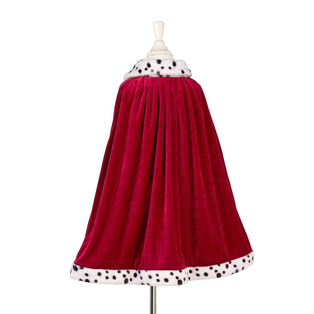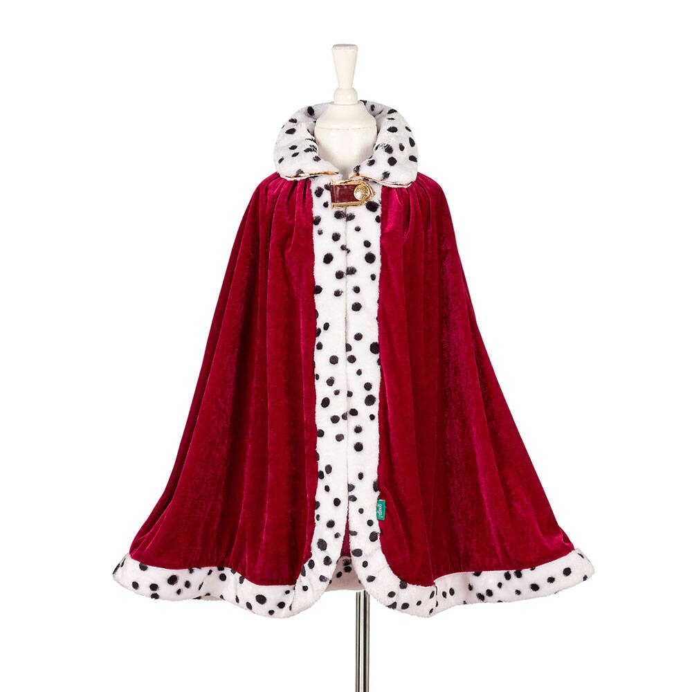 Królewska peleryna Louis holenderskiej marki Souza! to przepiękne, kunsztownie wykonane przebranie. Peleryna jest rozkloszowana, efektowna, z ciemno-czerwonego aksamitu, z klasycznym dla królewskich szat kołnierzem i obszyciem z gronostajowego futra (białego w czarne ciapki). Wokół zapięcia na rzep pod szyją ma złote wykończenie. Jest przyjemna w dotyku i komfortowa do noszenia. To idealny strój na bal przebierańców, Jasełka czy Sylwestra. Sprawdzi się także jako prezent.