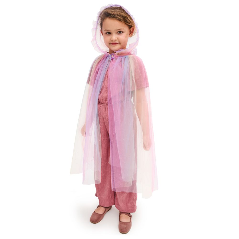 Tiulowy kaptur dodaje całości uroku i tajemniczości, a tęczowe kolory sprawiają, że strój pięknie prezentuje się w ruchu. Peleryna jest lekka, wygodna i bezpieczna, dzięki czemu dziecko może swobodnie tańczyć, biegać i czarować w swoim własnym, kolorowym świecie wyobraźni.
