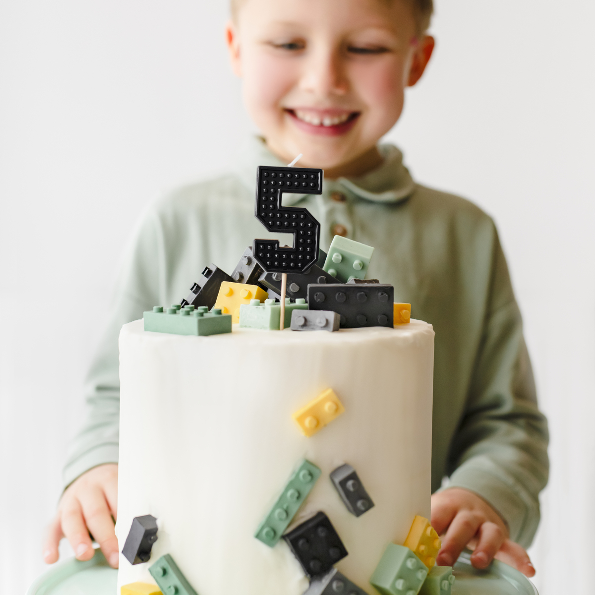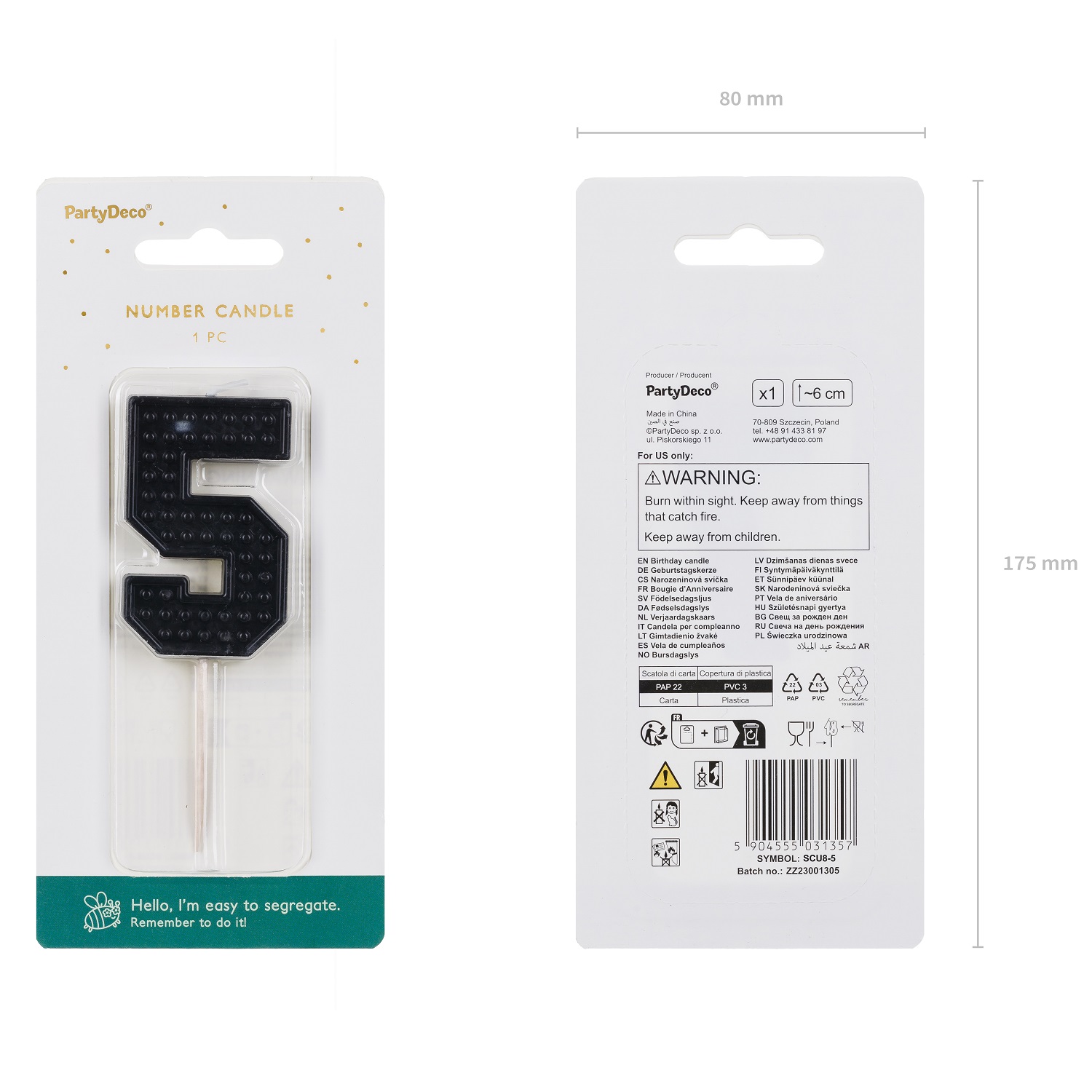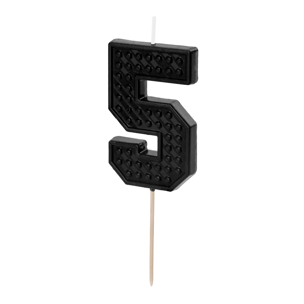 Świeczka urodzinowa Cyferka 5 we wzór klocka w kolorze czarnym. Rozmiar około 6 cm. Sprawdzi się na każdym torcie urodzinowym.