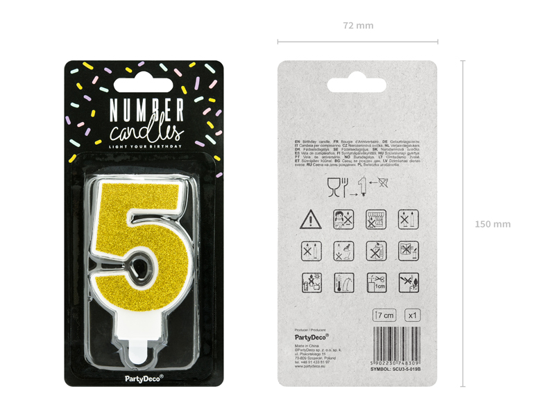 Świeczka urodzinowa Cyferka 5 w kolorze złotym brokatowym. Rozmiar około 7 cm. Sprawdzi się na każdym torcie urodzinowym.
