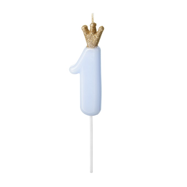 Świeczka urodzinowa Cyferka 1 w kolorze jasnoniebieskim z brokatową koroną. Sprawdzi się na każdym torcie urodzinowym.