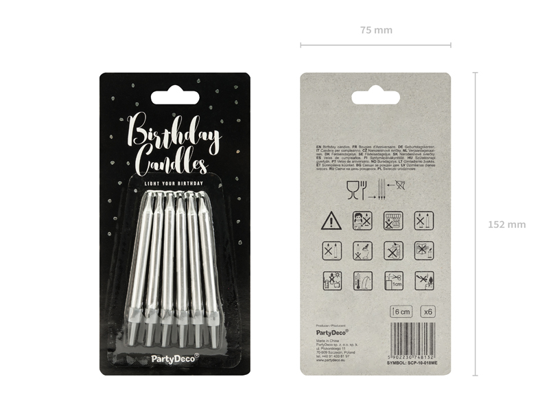 Świeczki urodzinowe gładkie w kolorze srebrnym metalizowanym, rozmiar ok. 6 cm, w zestawie 6 świeczek i 6 podstawek.