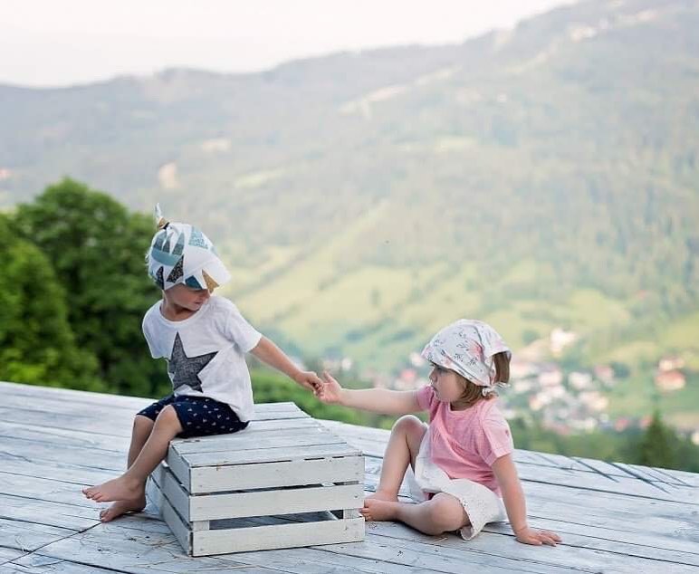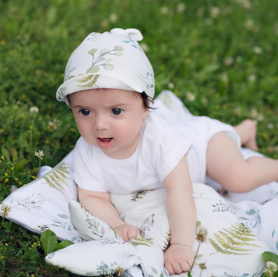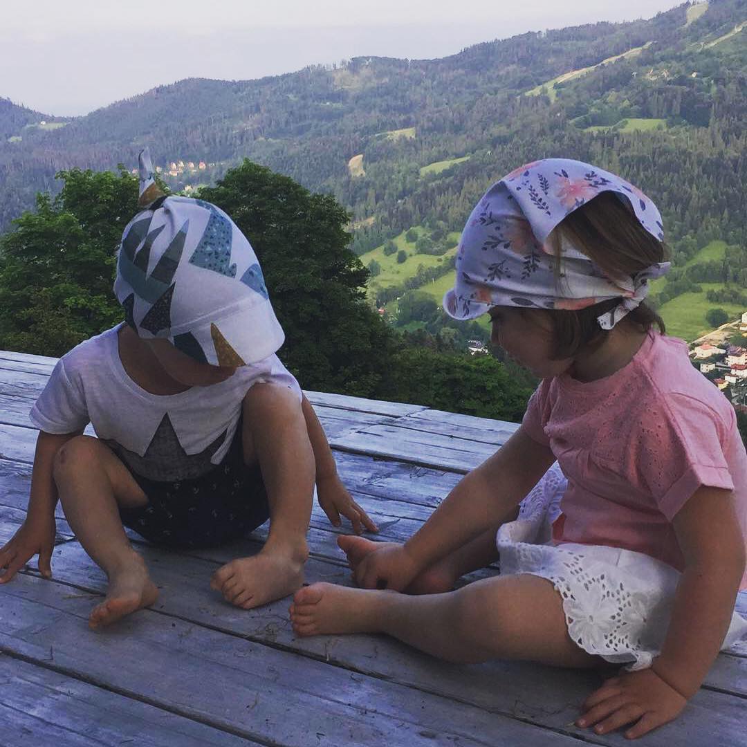 Wzór malowany ręcznie akwarelą w cudownych kolorach. Chustka z daszkiem Samiboo jest wiązana z tyłu głowy, ma uniwersalny rozmiar więc bez problemu dopasujesz ją do swojego dziecka.