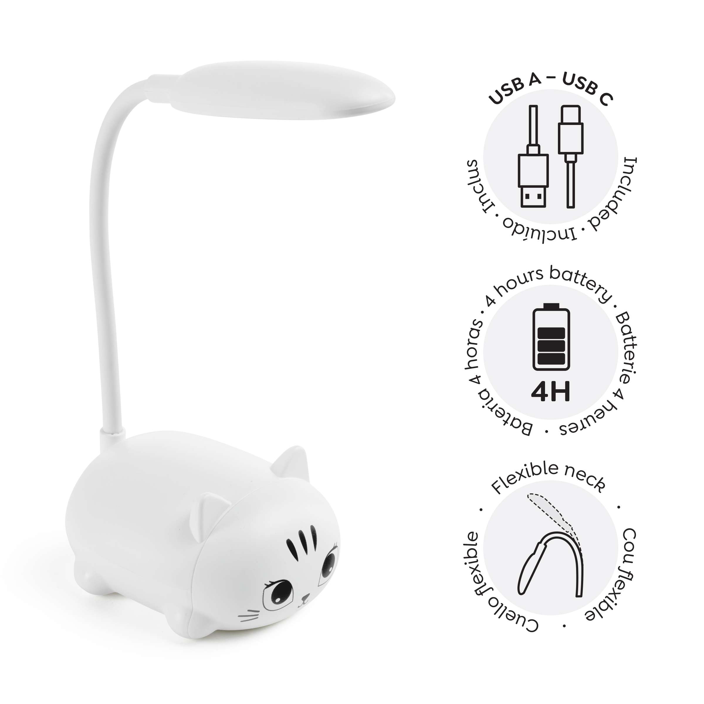 Lampka LED Miquelrius w kształcie białego kotka to uroczy i praktyczny dodatek do dziecięcego pokoju. Delikatne, ciepłe światło tworzy miłą atmosferę – idealną zarówno do zasypiania, jak i spokojnej zabawy. Giętkie ramię umożliwia łatwe ustawienie lampki w dowolnej pozycji, co zapewnia wygodę w użytkowaniu. Ładowana jest na USB A oraz C. Kabel do ładowania lampki znajduje się w zestawie. Po naładowaniu świeci do 4h bez potrzeby podłączania do prądu. Jest to idealna opcja dla rodziców szukających funkcjonalnej, ale także uroczej lampki, która dopełni wystrój dziecięcego pokoju.
